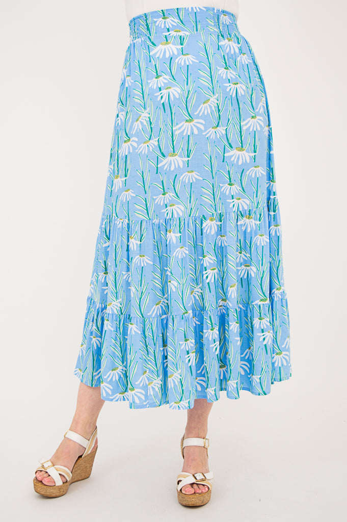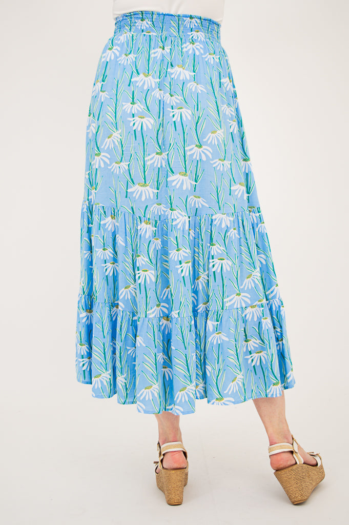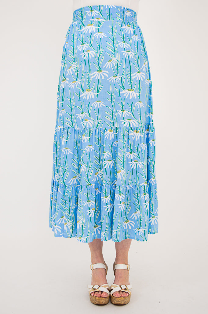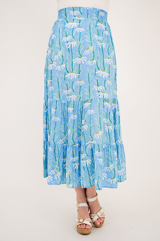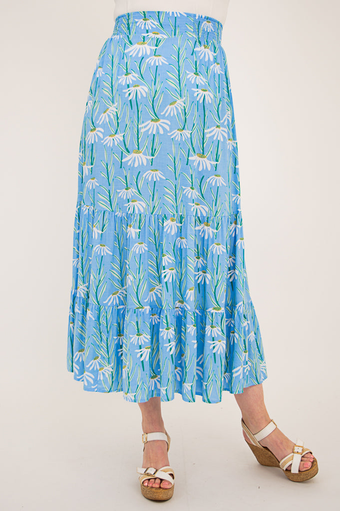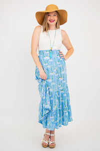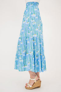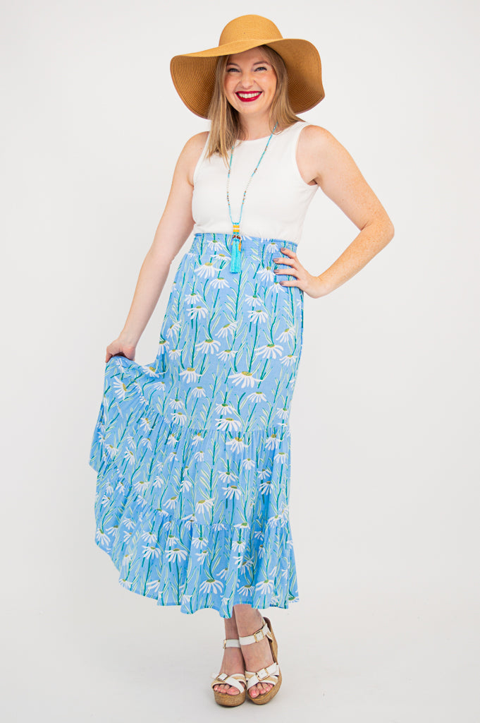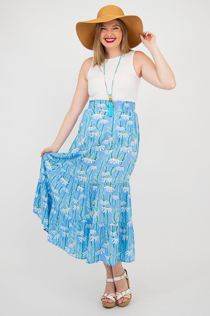 The perfect summer skirt; Tibby is lightweight. long and flowy. Hits just above the ankle and features an elastic waist for ease.