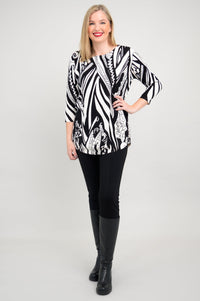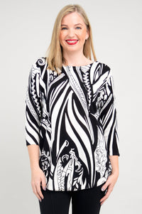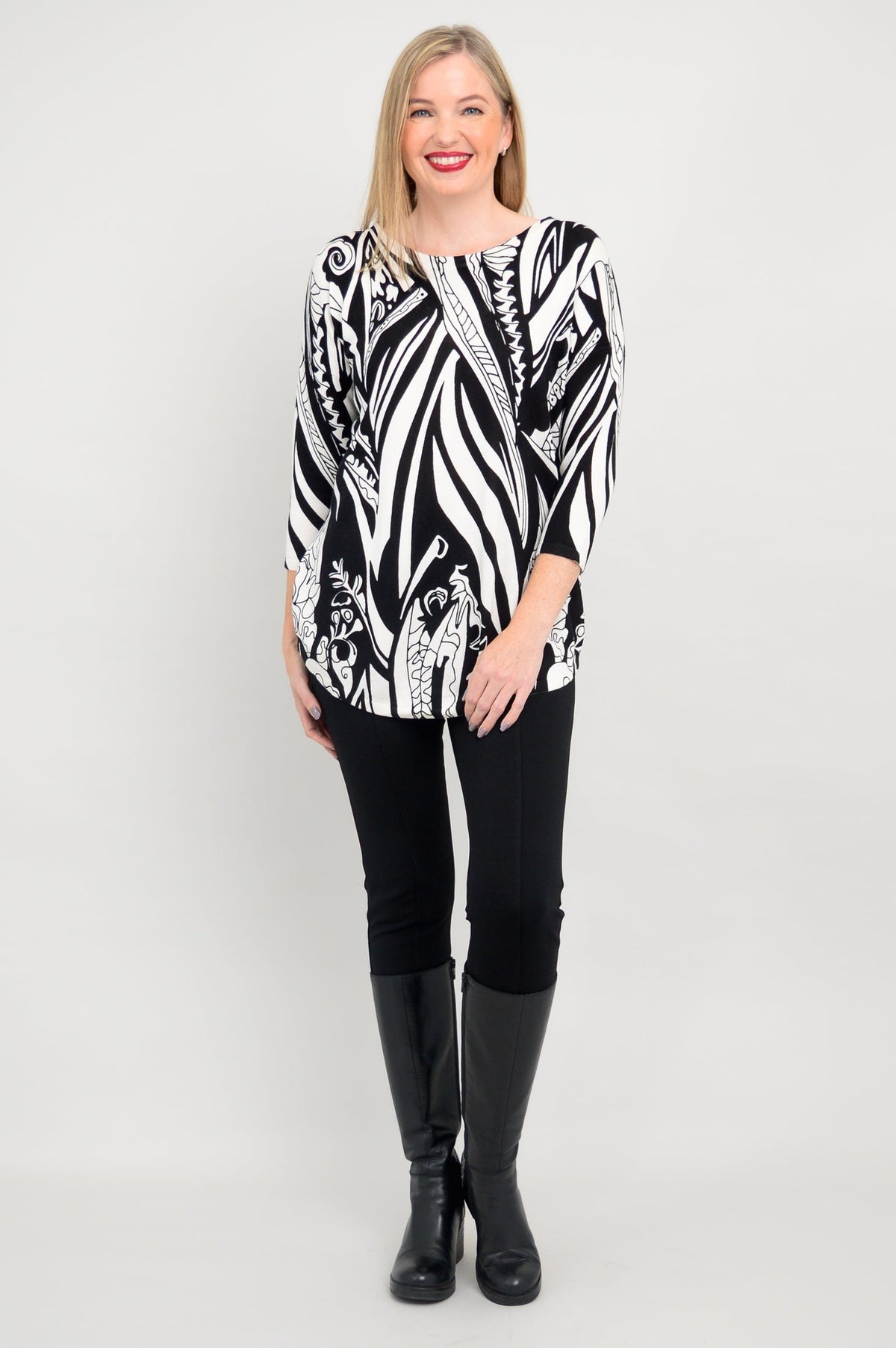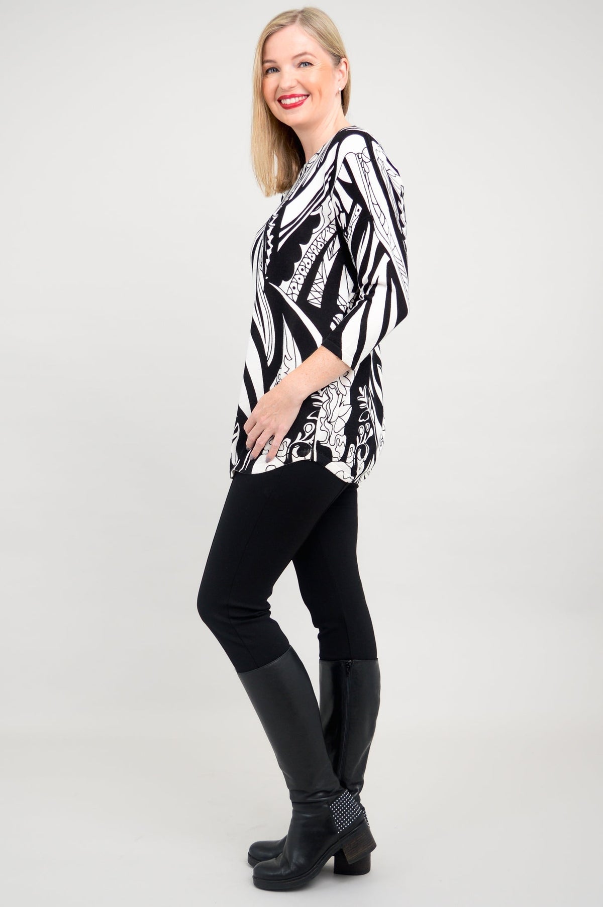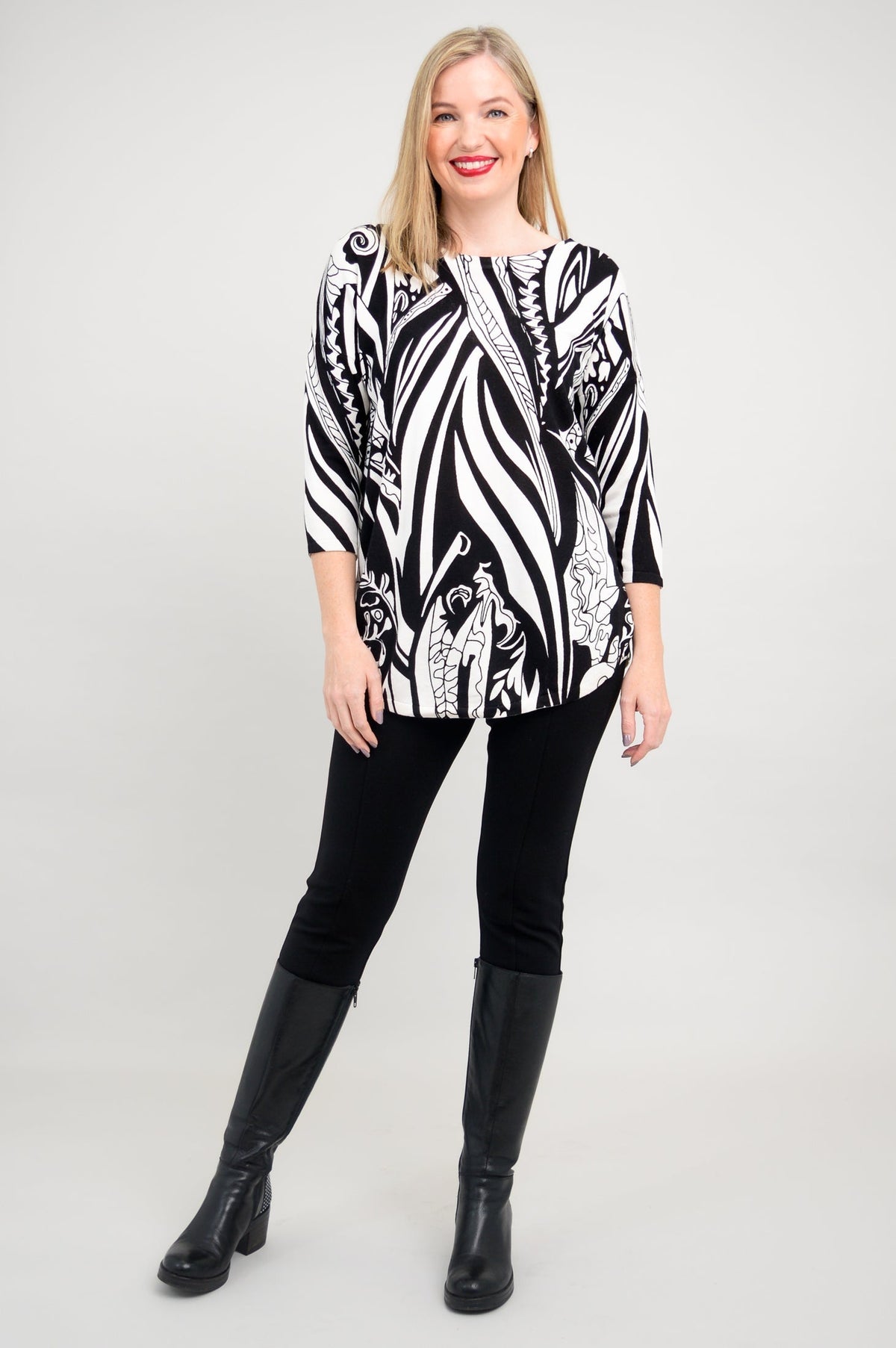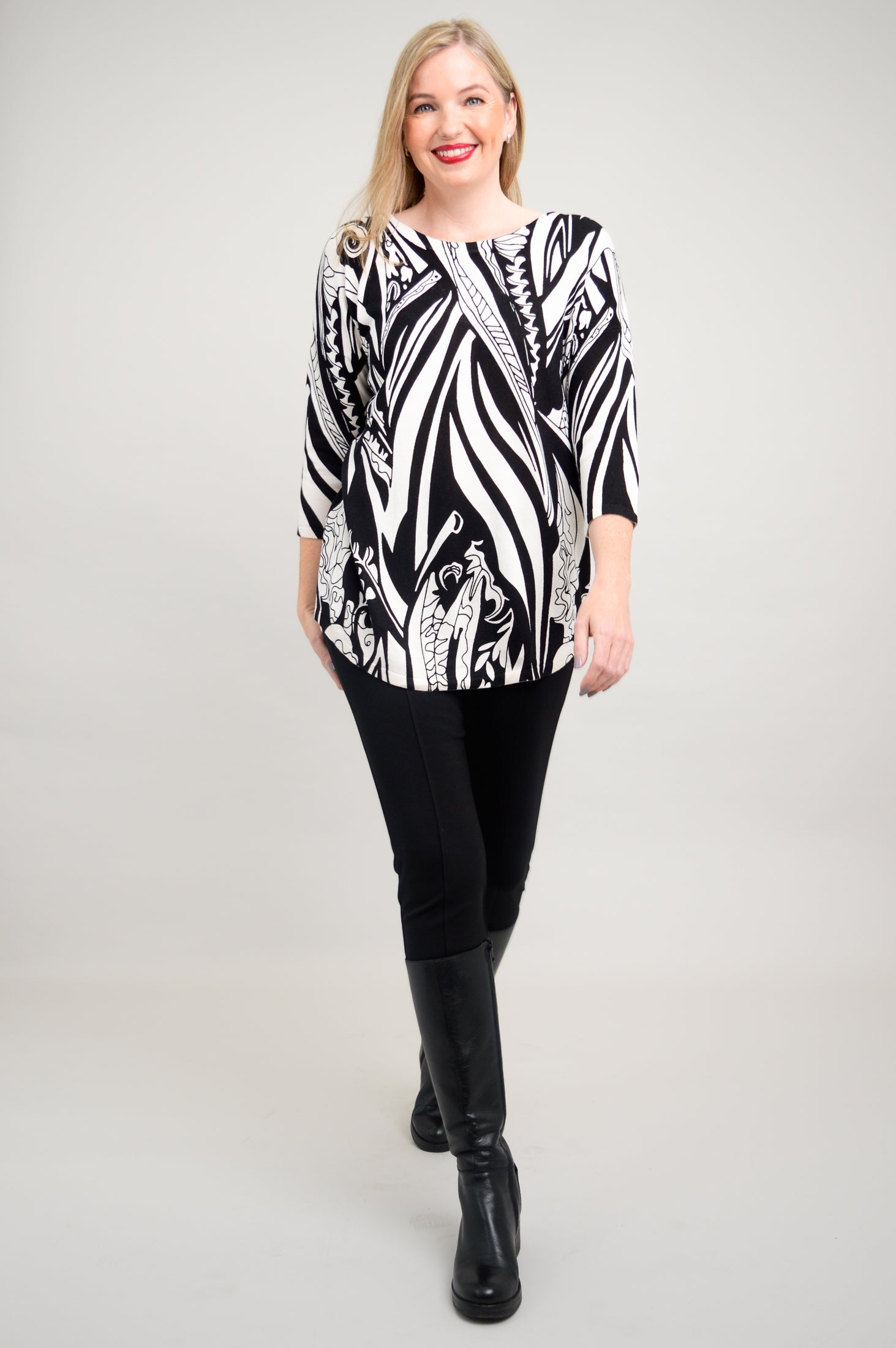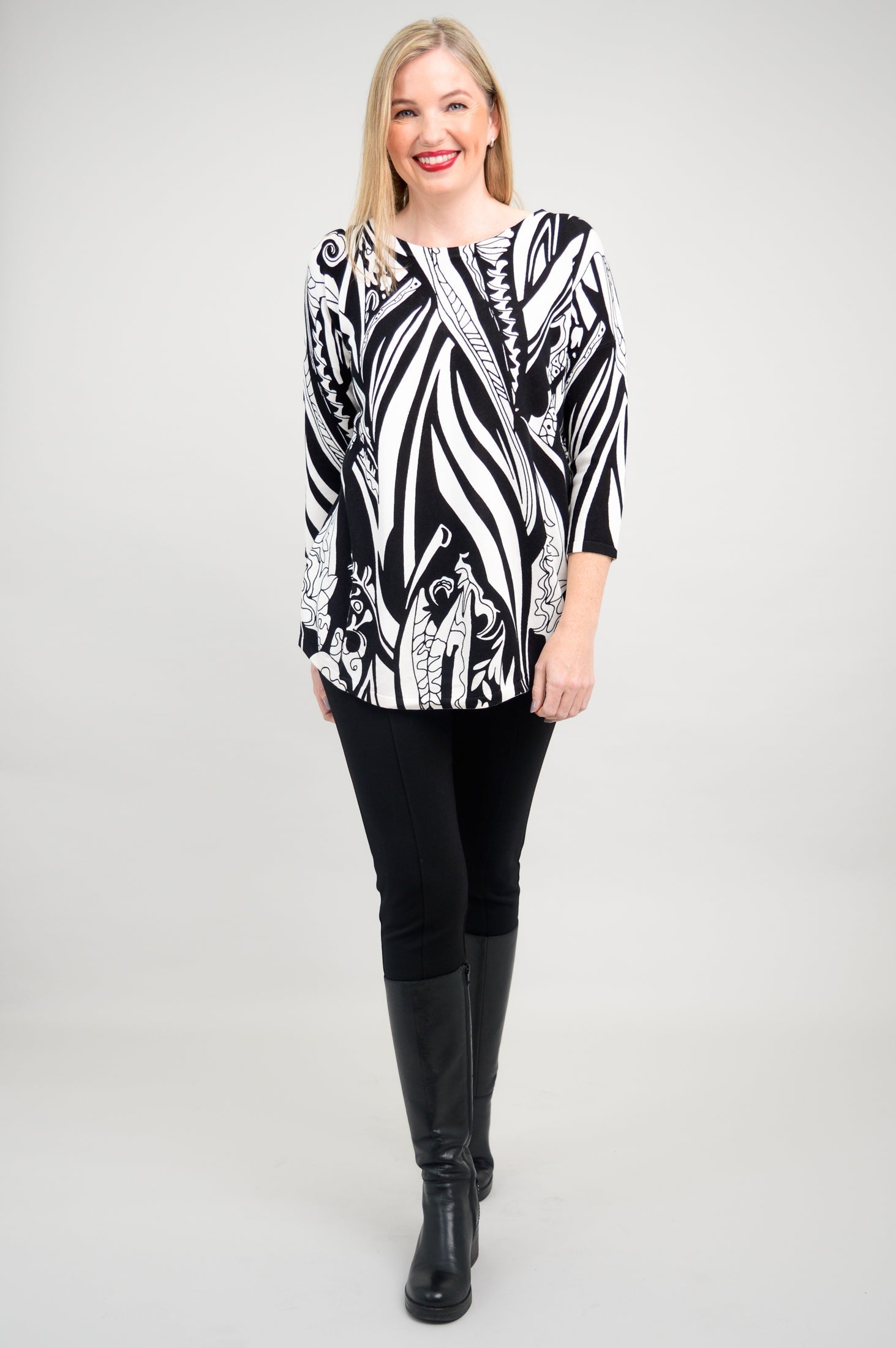 A casual pullover sweater, in breathable, temperature-regulating Bamboo/Cotton. 3/4 length sleeves and drop shoulders make for a relaxed look. The rounded hem is on the longer side, allowing for the Tina to also be worn as a tunic. Wear it with slim pants or leggings for a balanced look. Tina looks fantastic when paired with tall boots, for an easy Winter/Fall look.