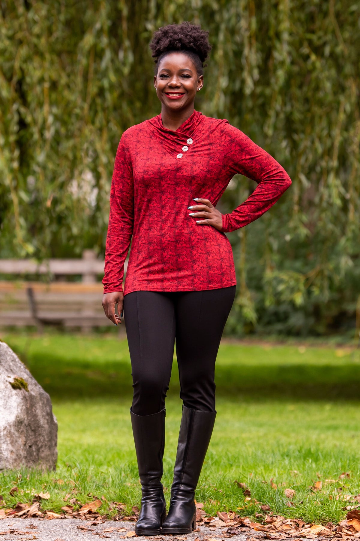 A draped mock neck with decorative, off-centre buttons is the star of this piece. Fitted through the sleeves and bodice, the hemline falls to just below the hip. Style the trinity with a vest, fitted pants and boots.