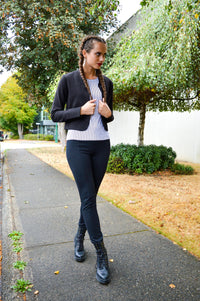 The Trust is cropped, modern and made of natural Modal material. A unique lapel design draws the eye up., inset slit pockets sit near the waist, and rounded edges transition the lapel into the coat hem. The no-closure style of this coat allows the wearer to show off their clothes underneath. Style the Trust Coat over a simple fitted top and bottoms, or an A-line dress.