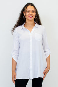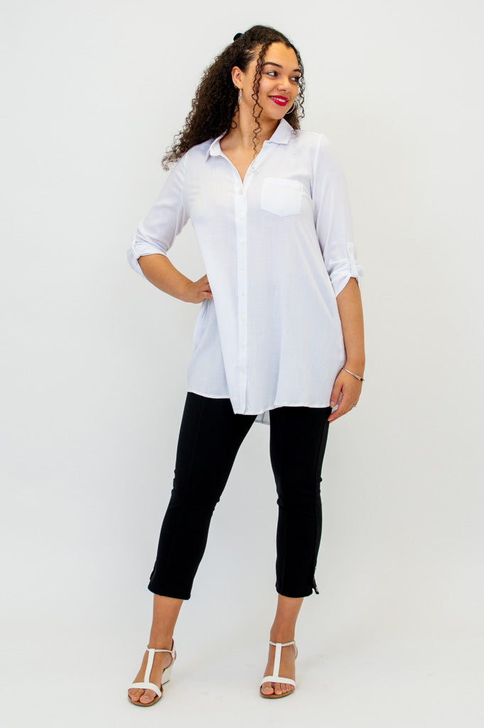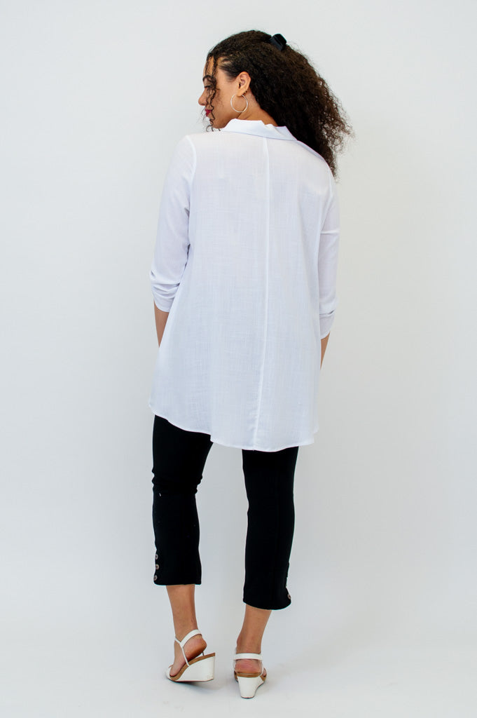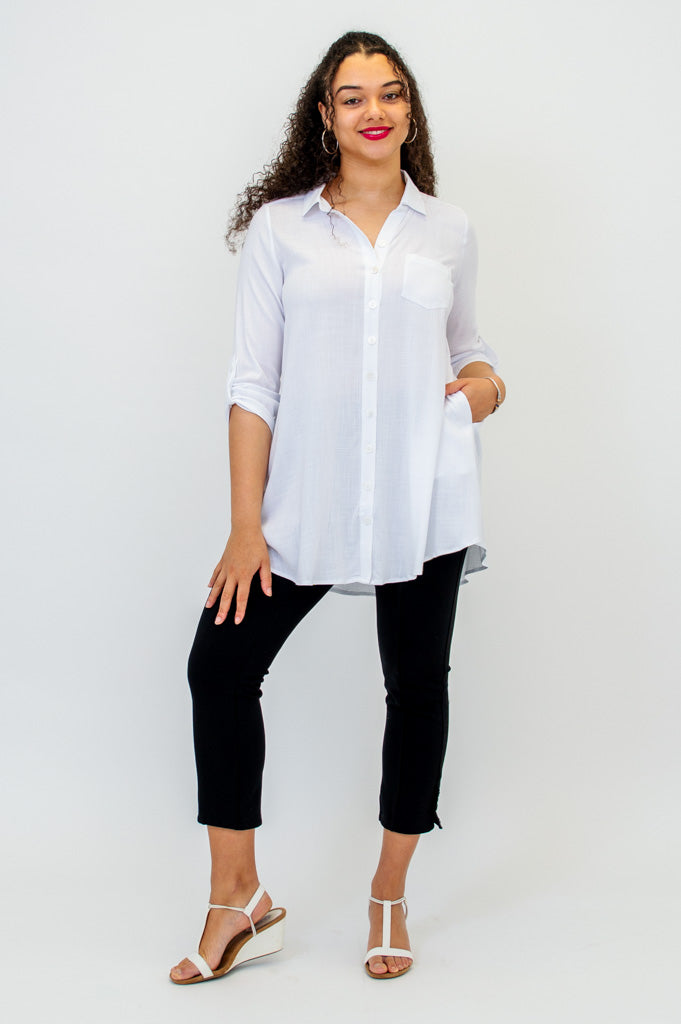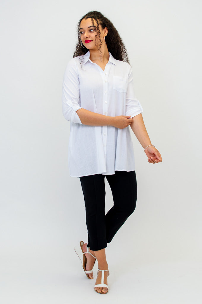 The soft shape of Bamboo/Linen in an oversized tunic with pockets. Shirt style at the shoulder, with a collar and button placket down the front. The Celine falls into a flowy and full, A-line shape. Pair it with capri pants or leggings.