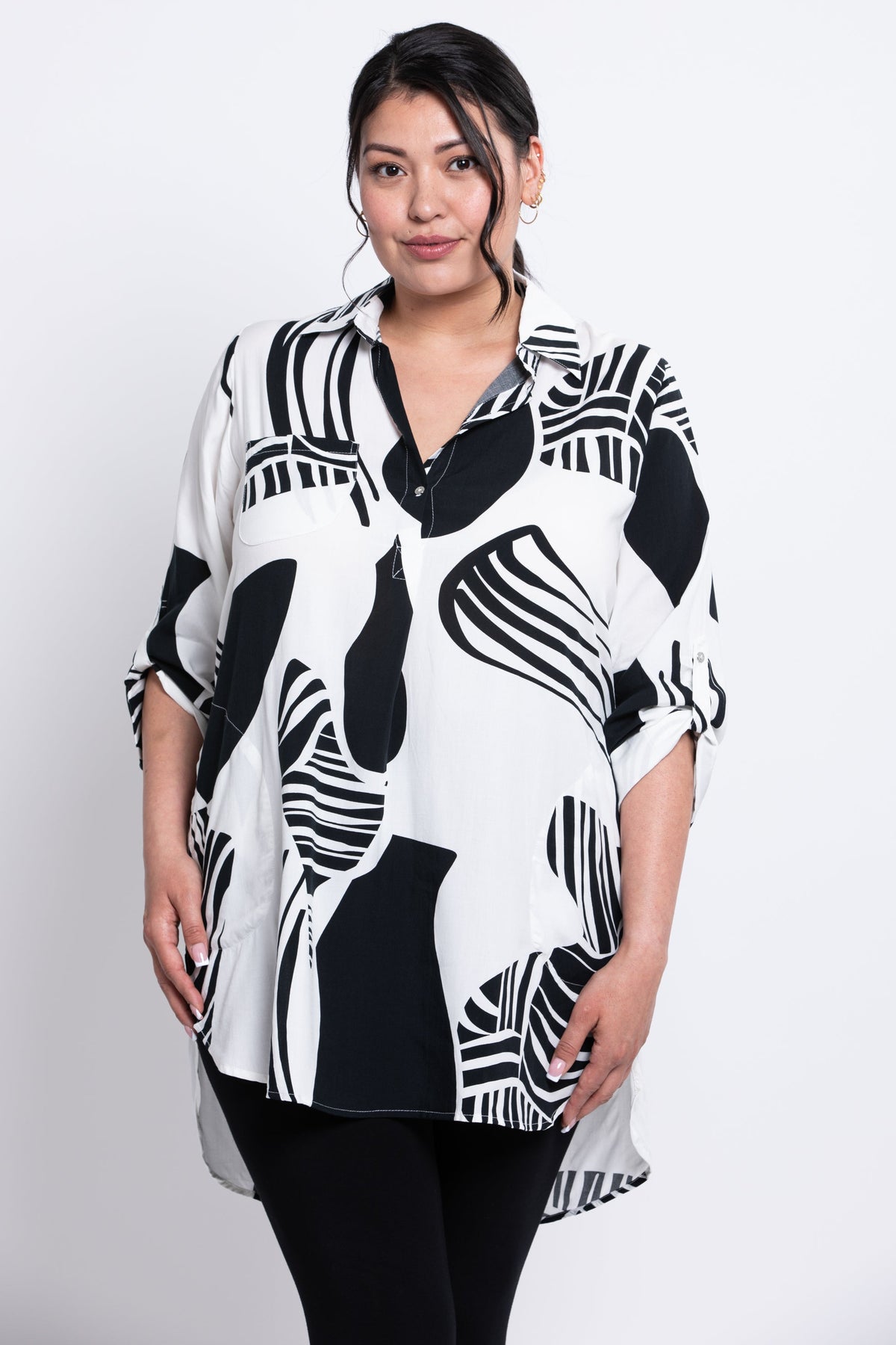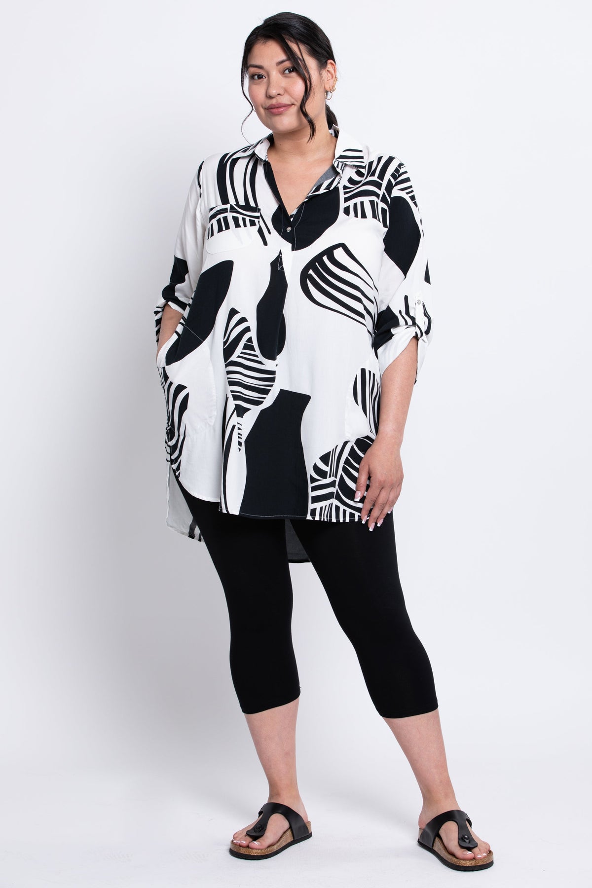 The Queenie has several stand-out features that you will love, most importantly - pockets! It also has 3/4 roll tab sleeves and a high-low hemline that allows for extra flow and movement. We love pairing the Queenie with leggings.