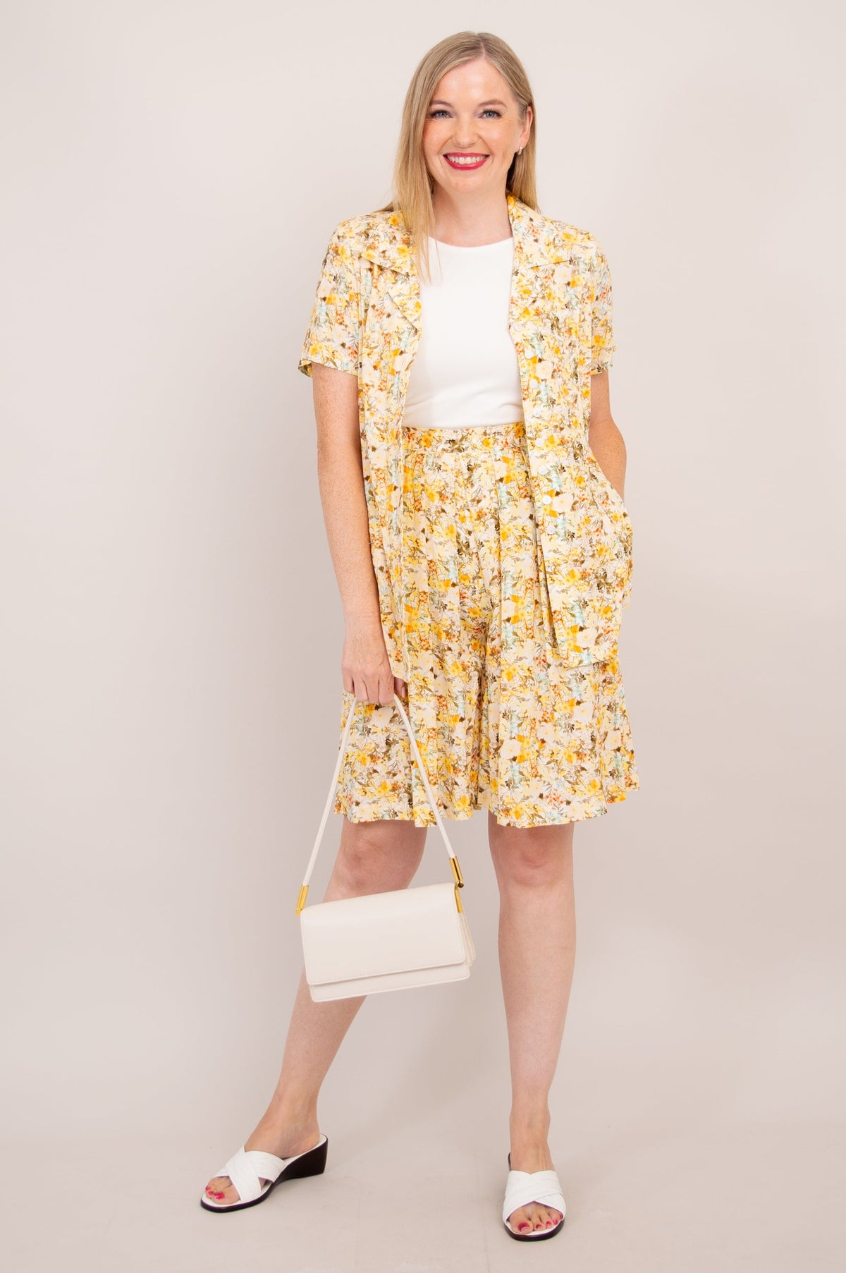 The Betty Shorts are the perfect lightweight, modest shorts for any Spring/Summer occasion! The high-waisted pleats and elastic waistband in the back make for a forgiving fit. The hem hits just above the knee making for extra coverage without additional bulky fabric. They have an invisible zipper side closure. With two inseam pockets, these shorts are incredibly versatile and easy to style. Pair with the matching Samantha Top for an effortless outfit!