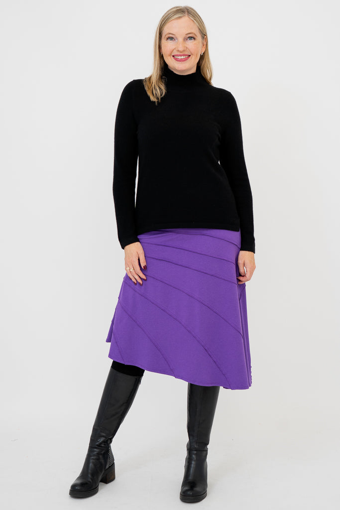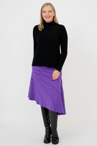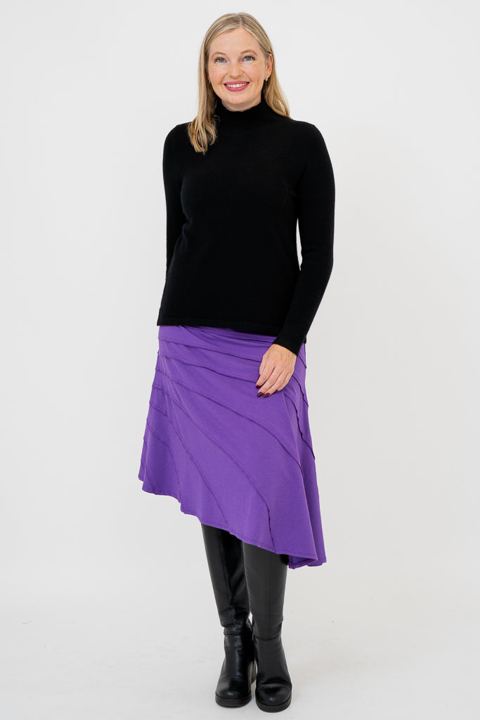 The Beverly boasts an asymmetrical design with raw edges that captures the essence of modern elegance. Hemmed just below the knee, its flowing lines create a sense of movement and fluidity. The self-fabric waistband ensure all day comfort.