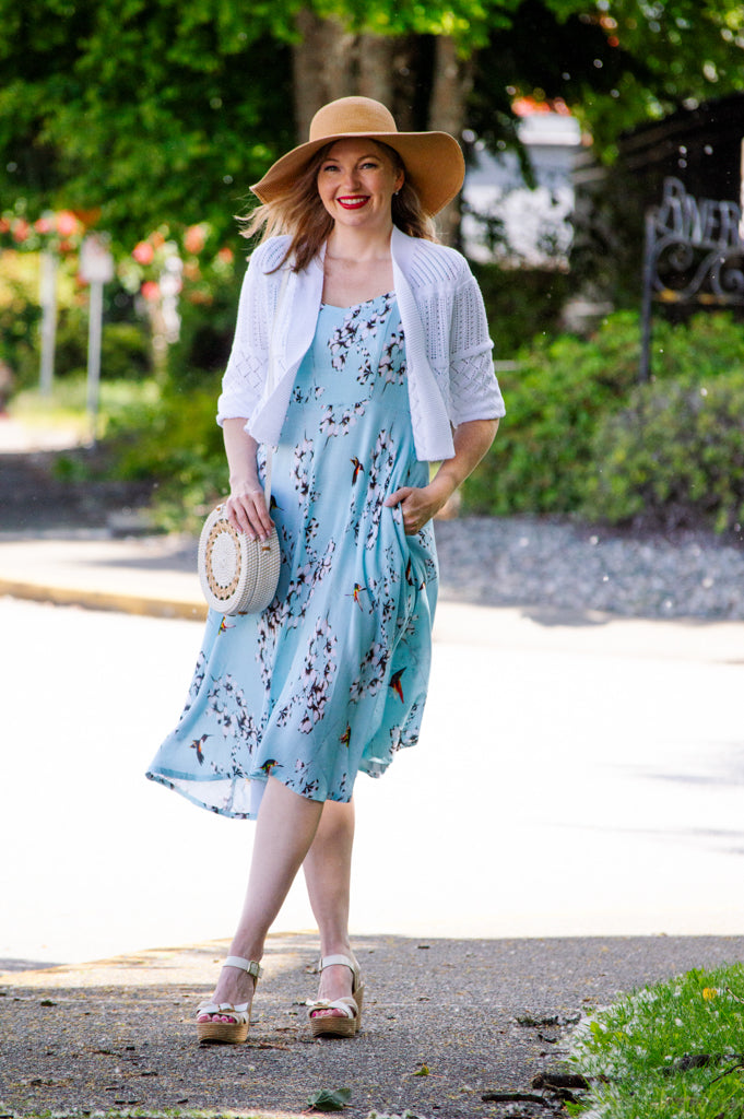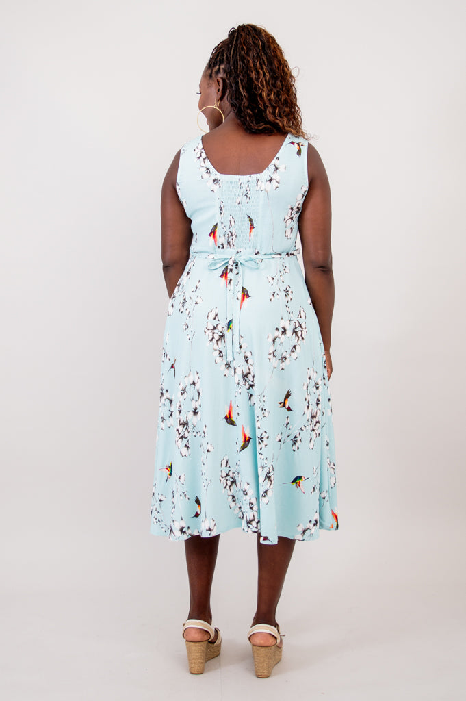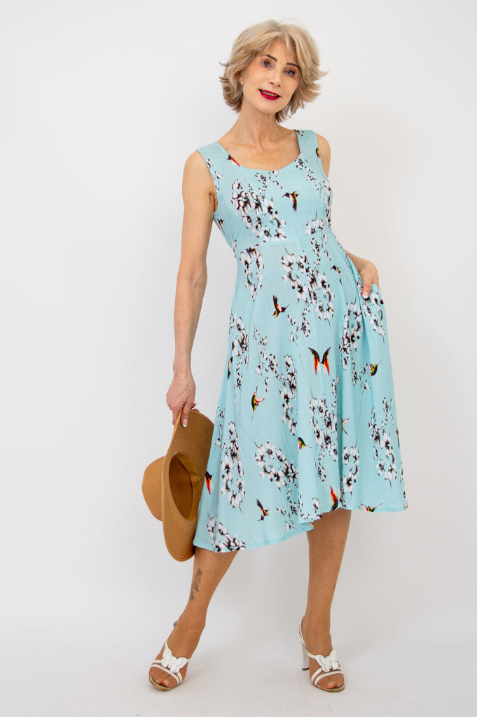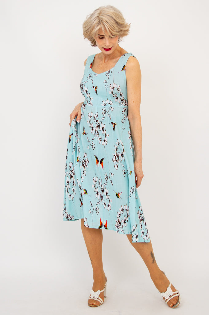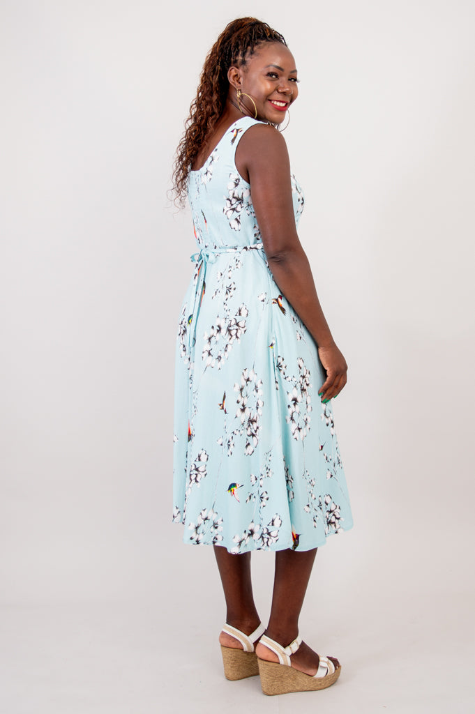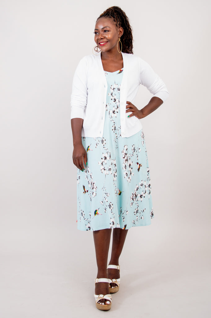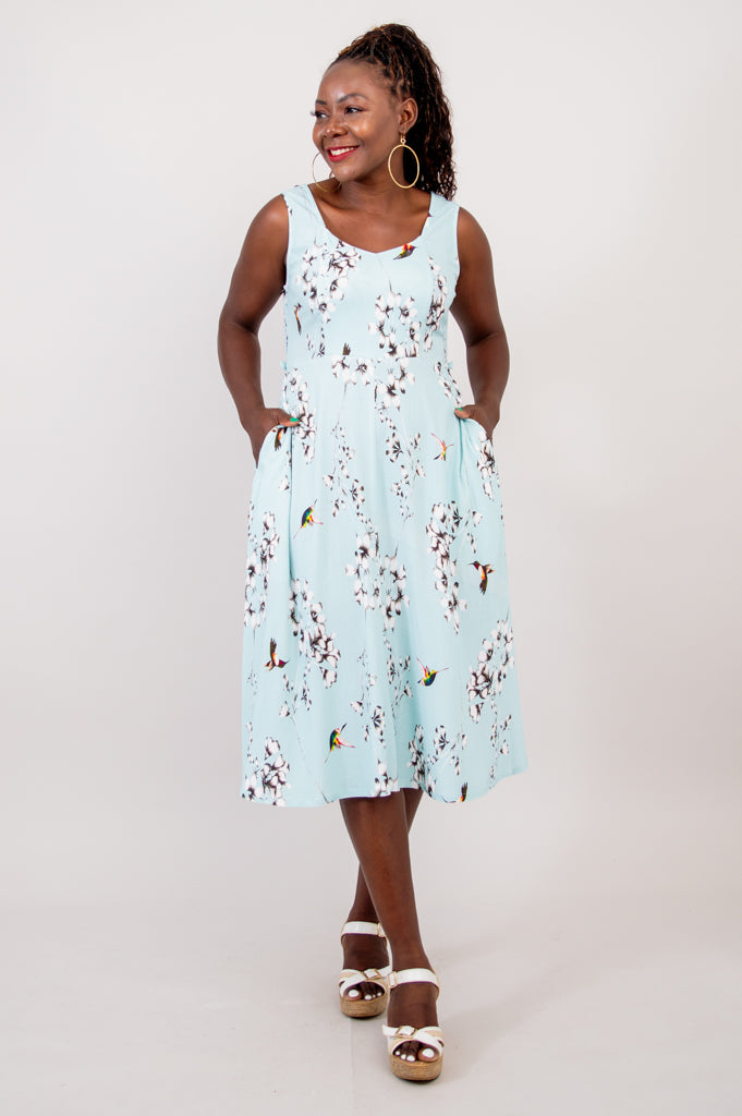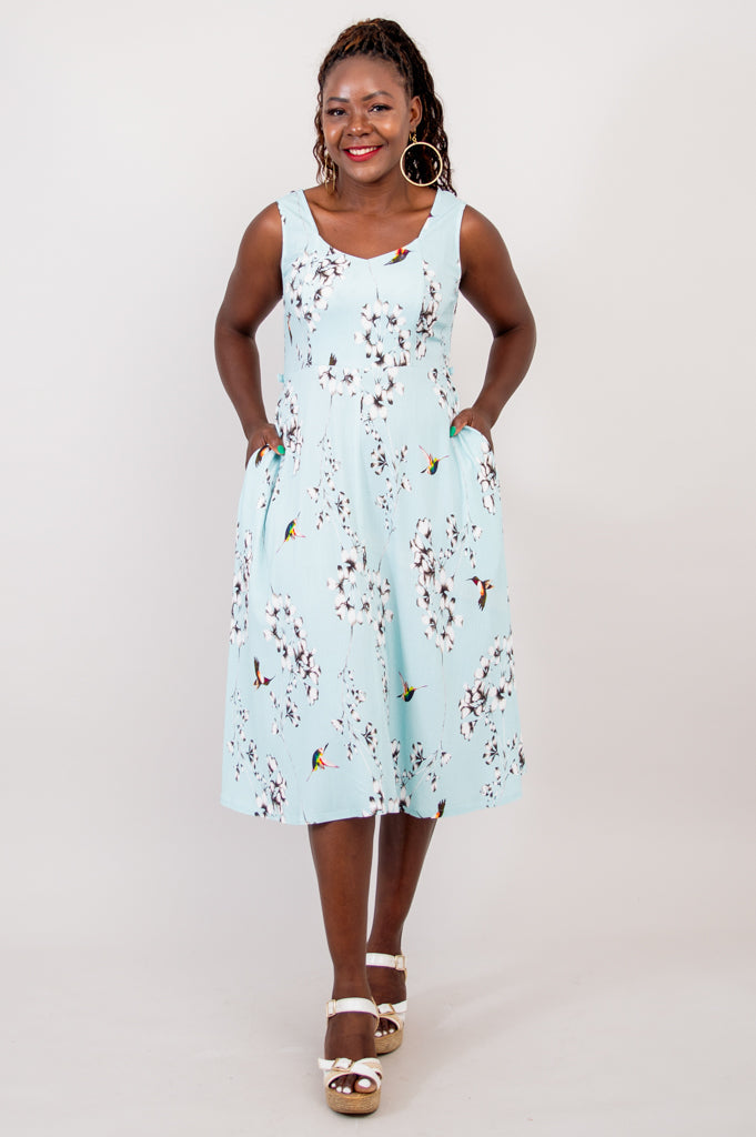 The Bristol features a moderate square neckline with wide shoulder straps. Fitted through the bodice, the Bristol then cascades into a slight A-line shape, with extra definition thanks to a tie waist. The hem falls to mid-calf, making the Bristol the perfect length for wearing with heels or wedge sandals.