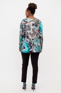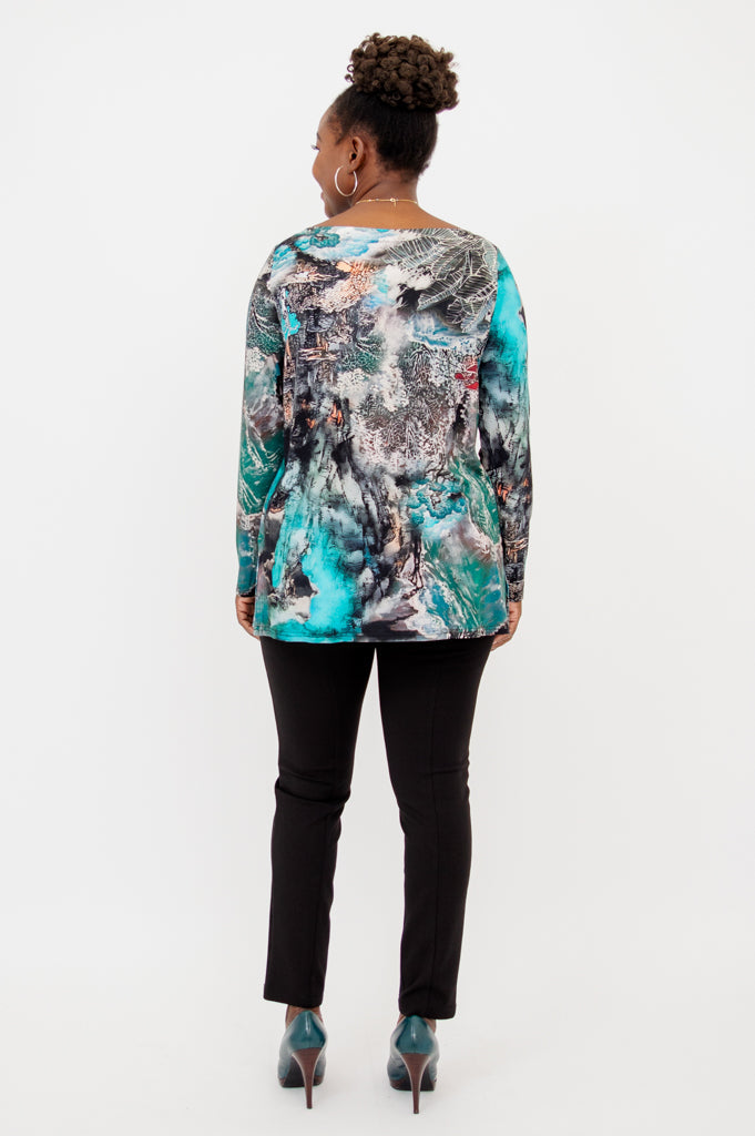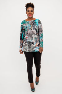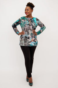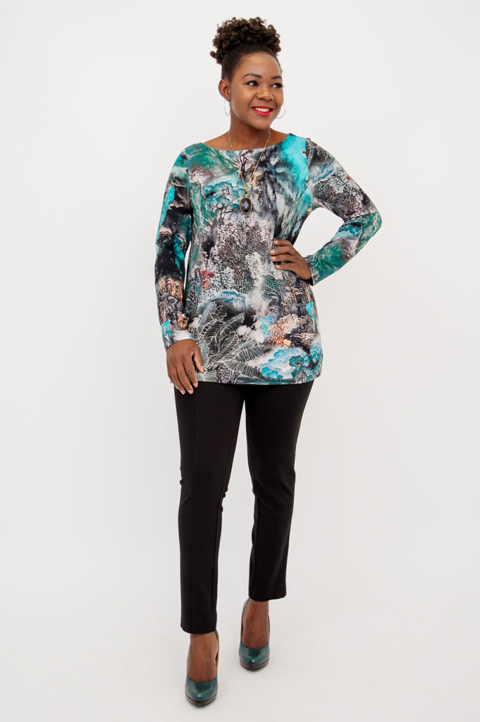 The Cheerful top has a slight boat neckline and long sleeves for a fitted, clean look. The top falls to the top of the thigh with slits on either side of the hem. Perfect with a pair of slim pants or a skirt.