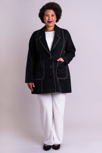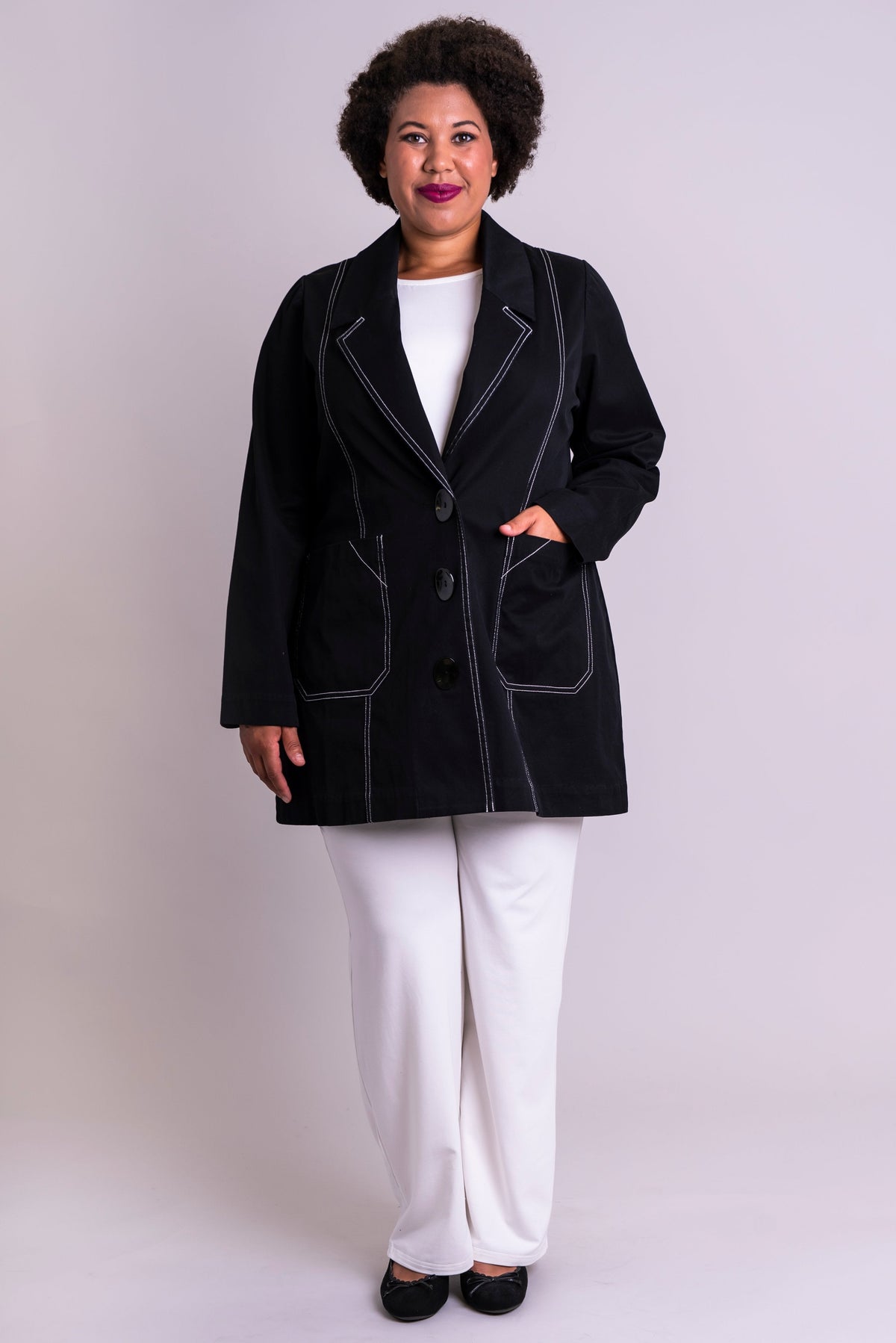 Signature jacket with contrasting stitching. Bring a touch of tailoring to the wardrobe with this three-season layering piece.