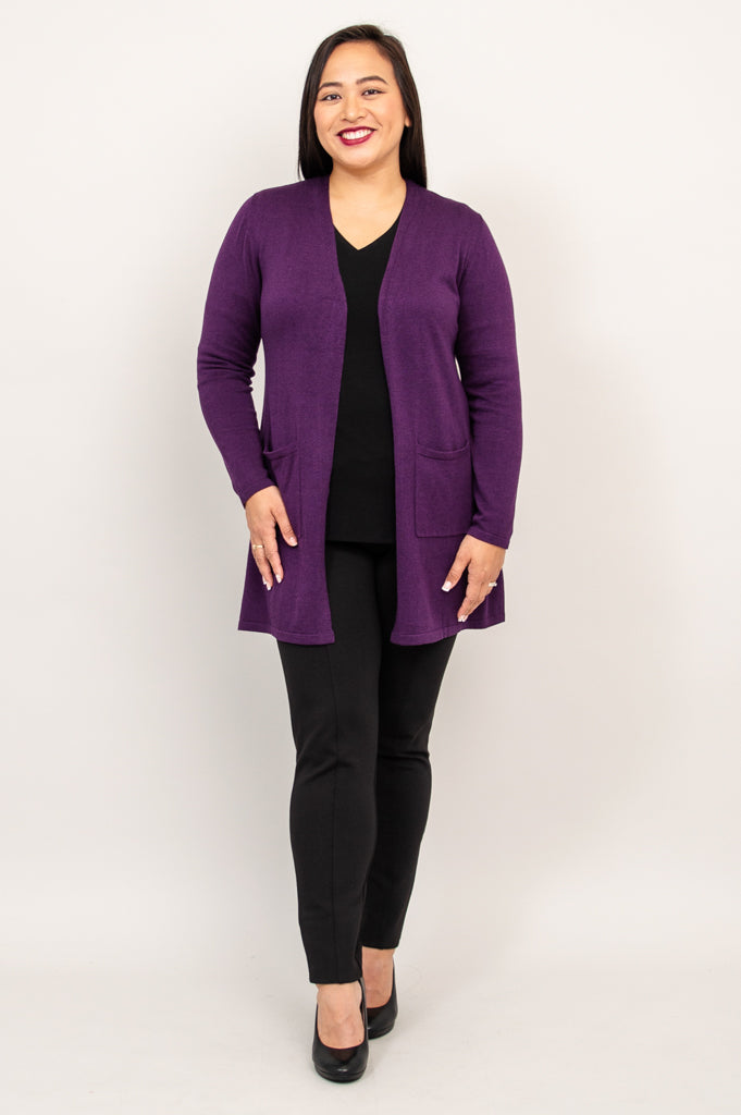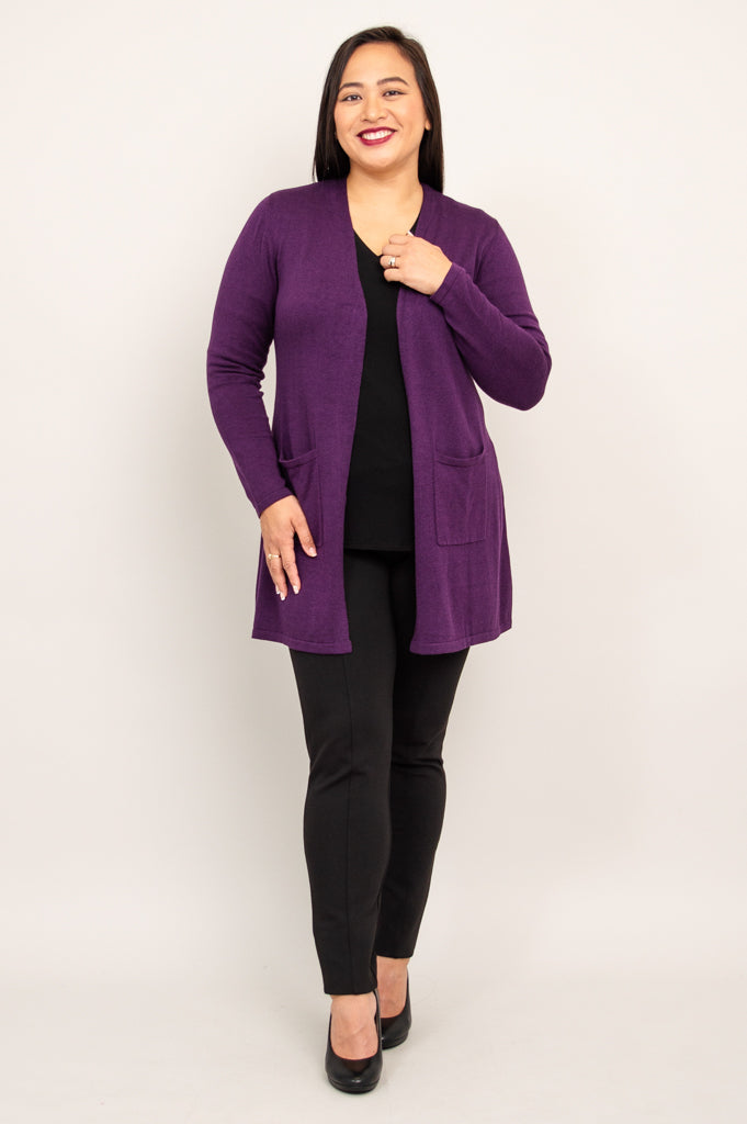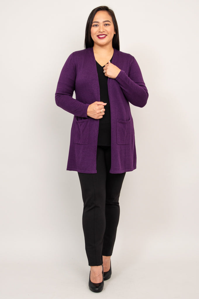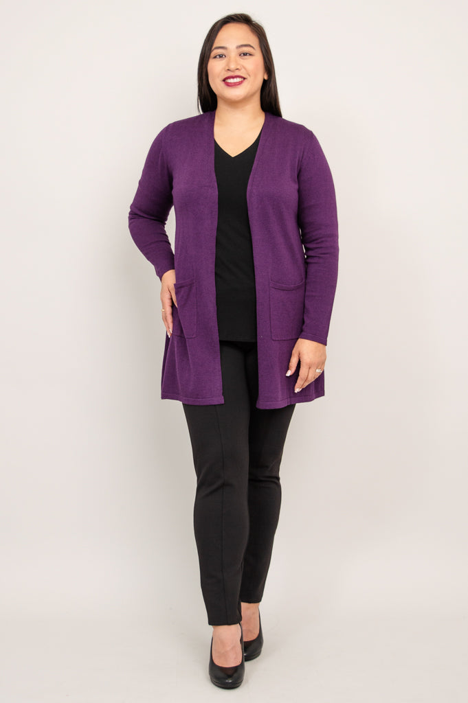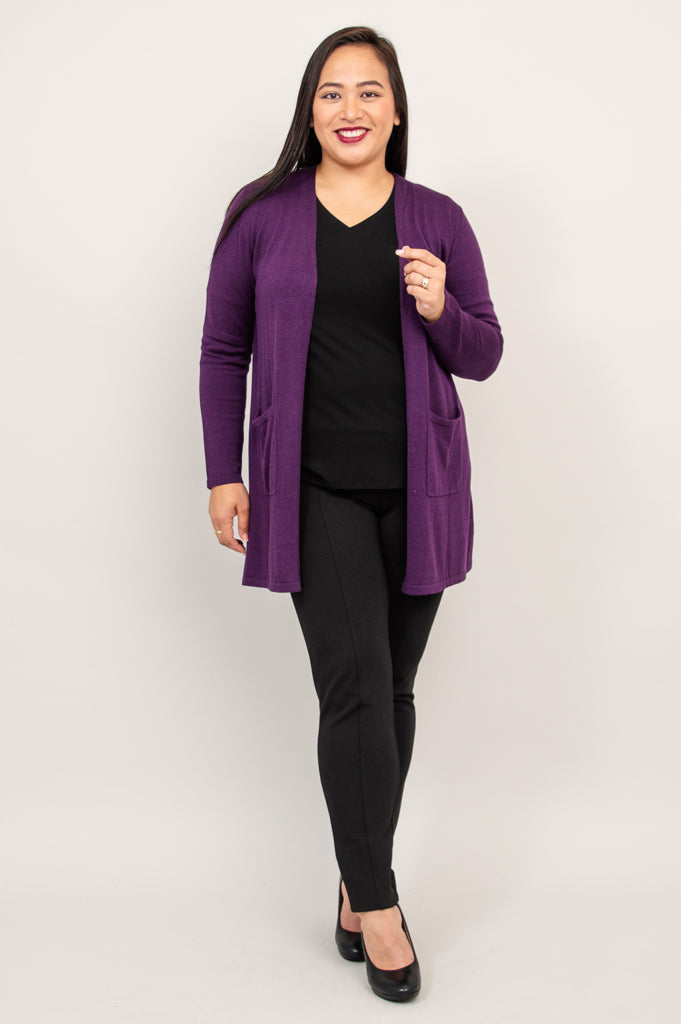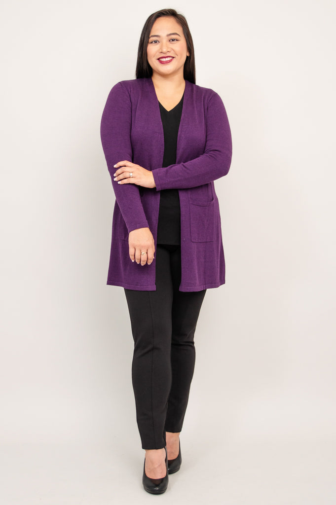Our beloved Justine Sweater is wardrobe must-have! An open style cardigan with pockets for functionality and long, slimming lines. The Justine is designed to fall a bit lower, allowing for good coverage. Layer it over dresses, blouses and sleeveless tops.