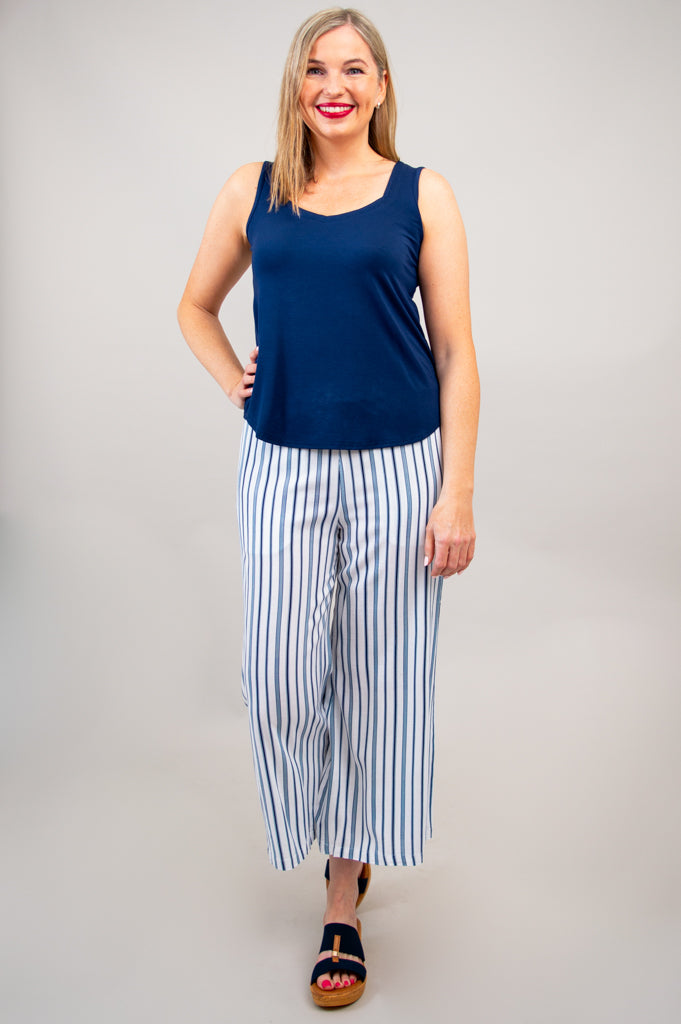 A Capri version of our best-selling Landon Pant. This easy pull on pant features a wider leg from hip to hem.  The bamboo waistband can be worn high or folded over.