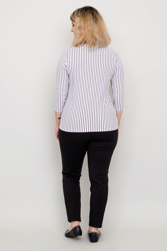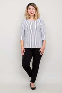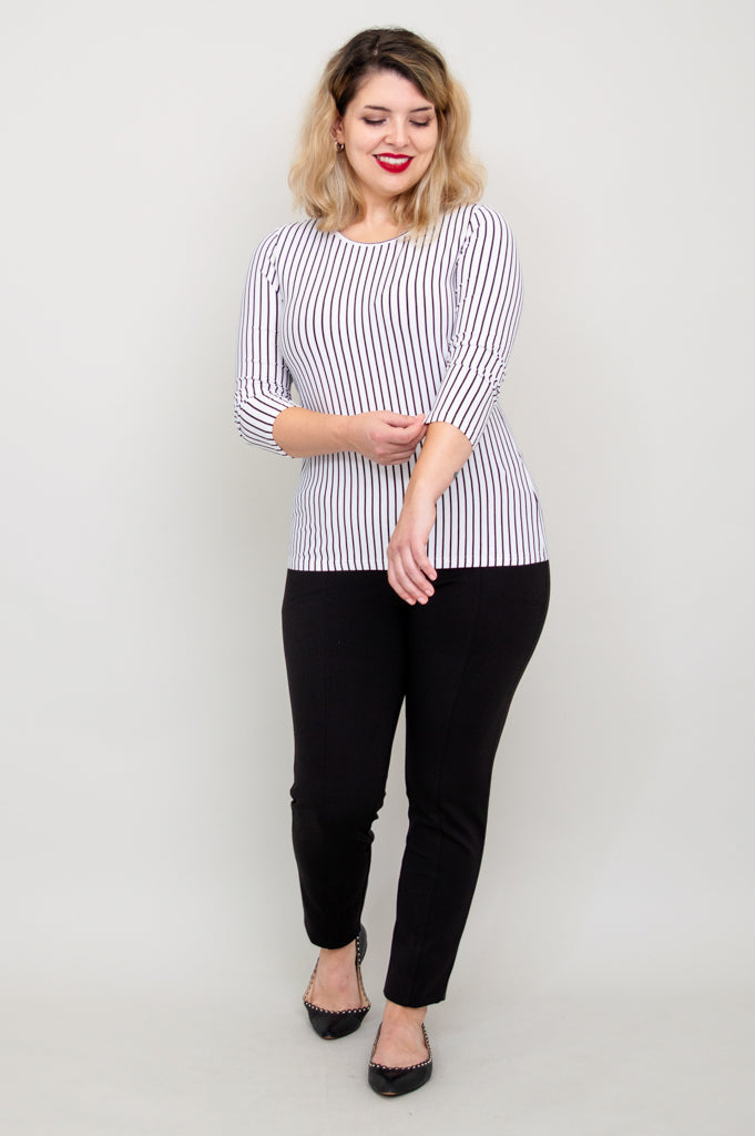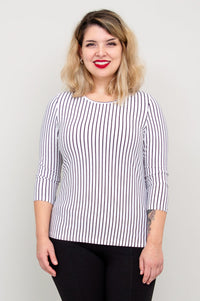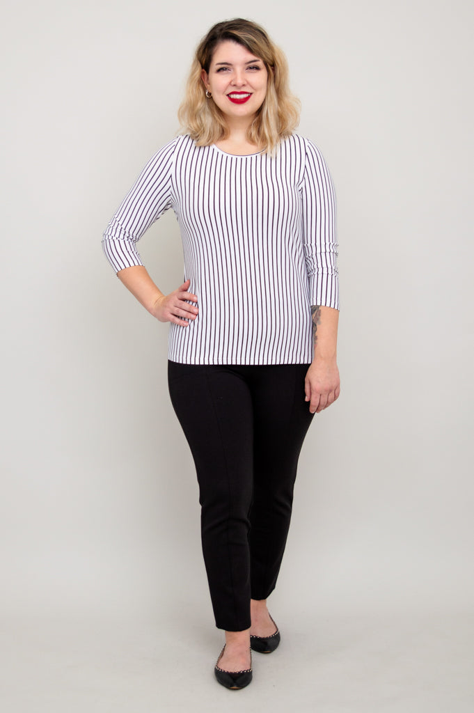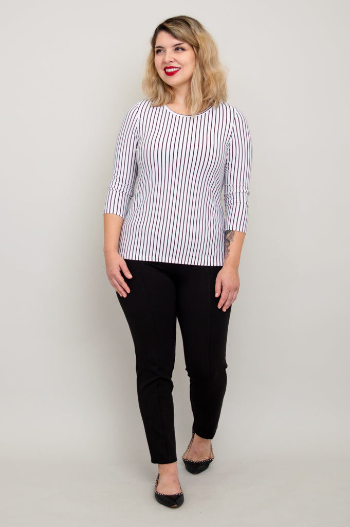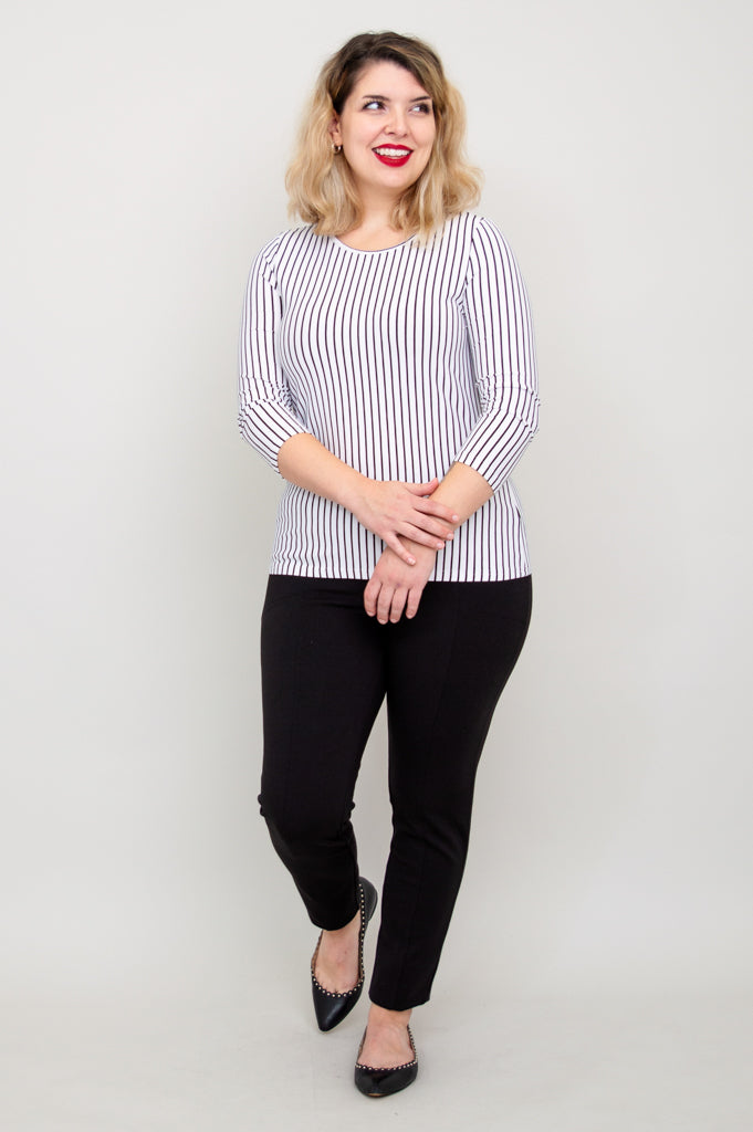 Margorie is the perfect basic tee. It is a more fitted style featuring 3/4 sleeves and a high round neck. This is your perfect layering piece.