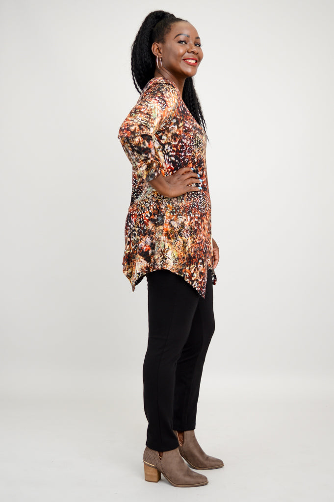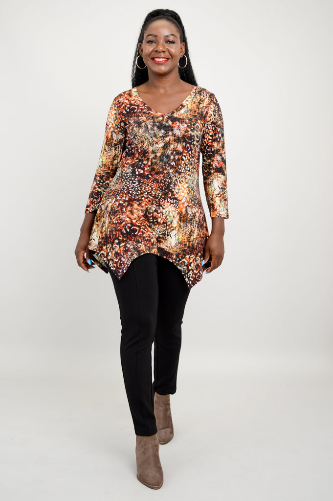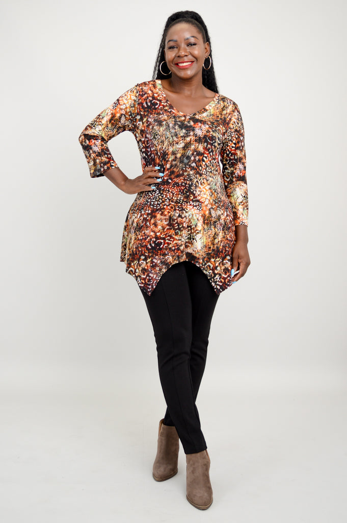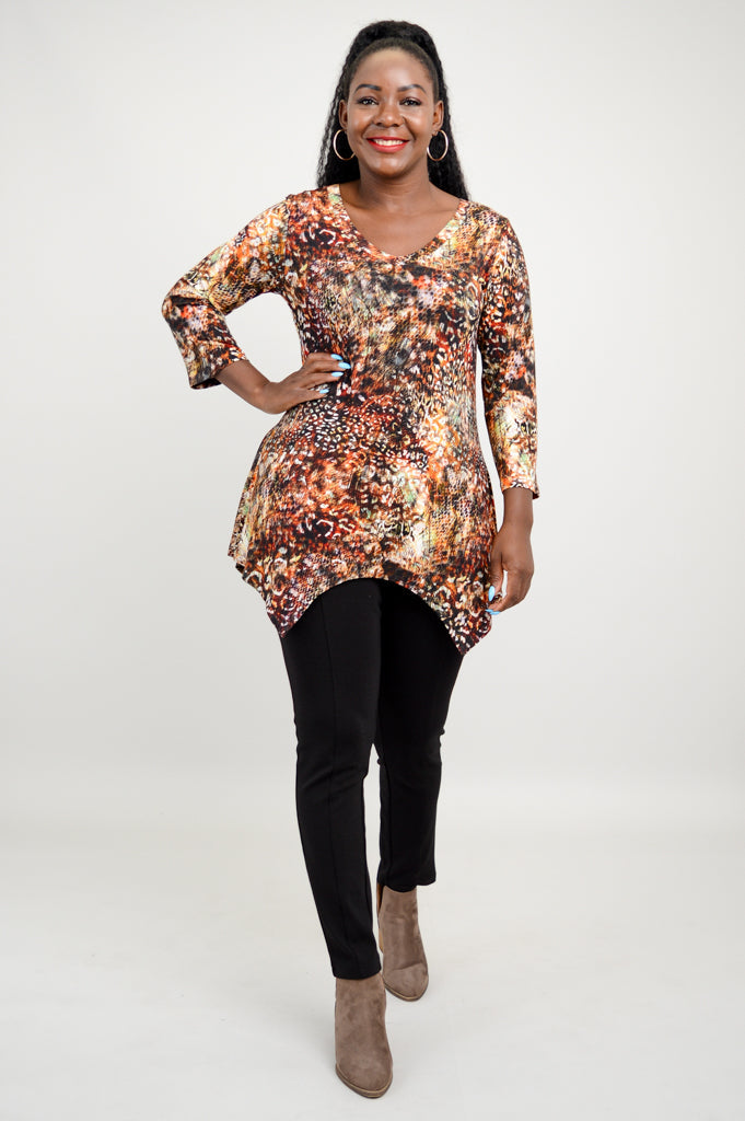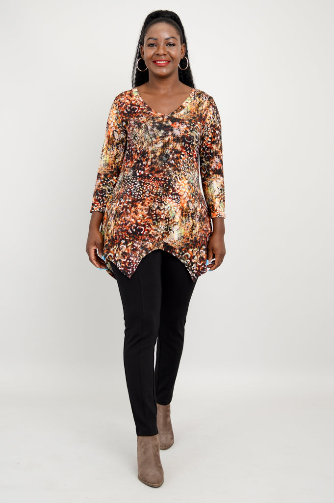 The Maude 3/4 Sleeve Top is perfect for adding additional movement and texture to any outfit. The slight V-Neckline adds to the elongated silhouette, and the handkerchief hem adds depth and contrast to any outfit! Dress this top up for a night out, or pair it with a pair of trousers for an every day look.