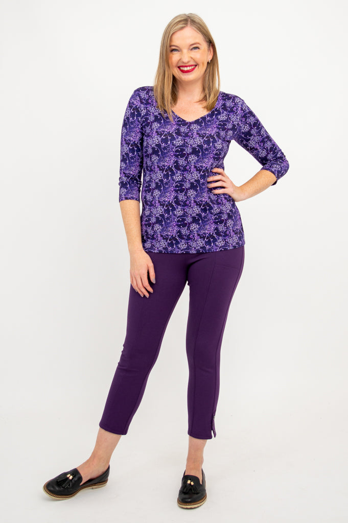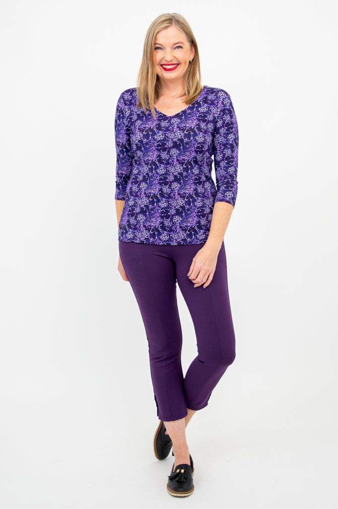 Flattering whether worn loose or body-con. The Mia Top is made of stretchy Bamboo, and has two layers in the front for added structured. Bamboo is cool, so this double layer remains a comfortable option. A soft V-neckline suggests a vertical axis, and aligns with tapered shape down the body. T-shirt simplicity with a very shapely fit, the Mia a great choice for pairing with a variety of different pants and skirts.