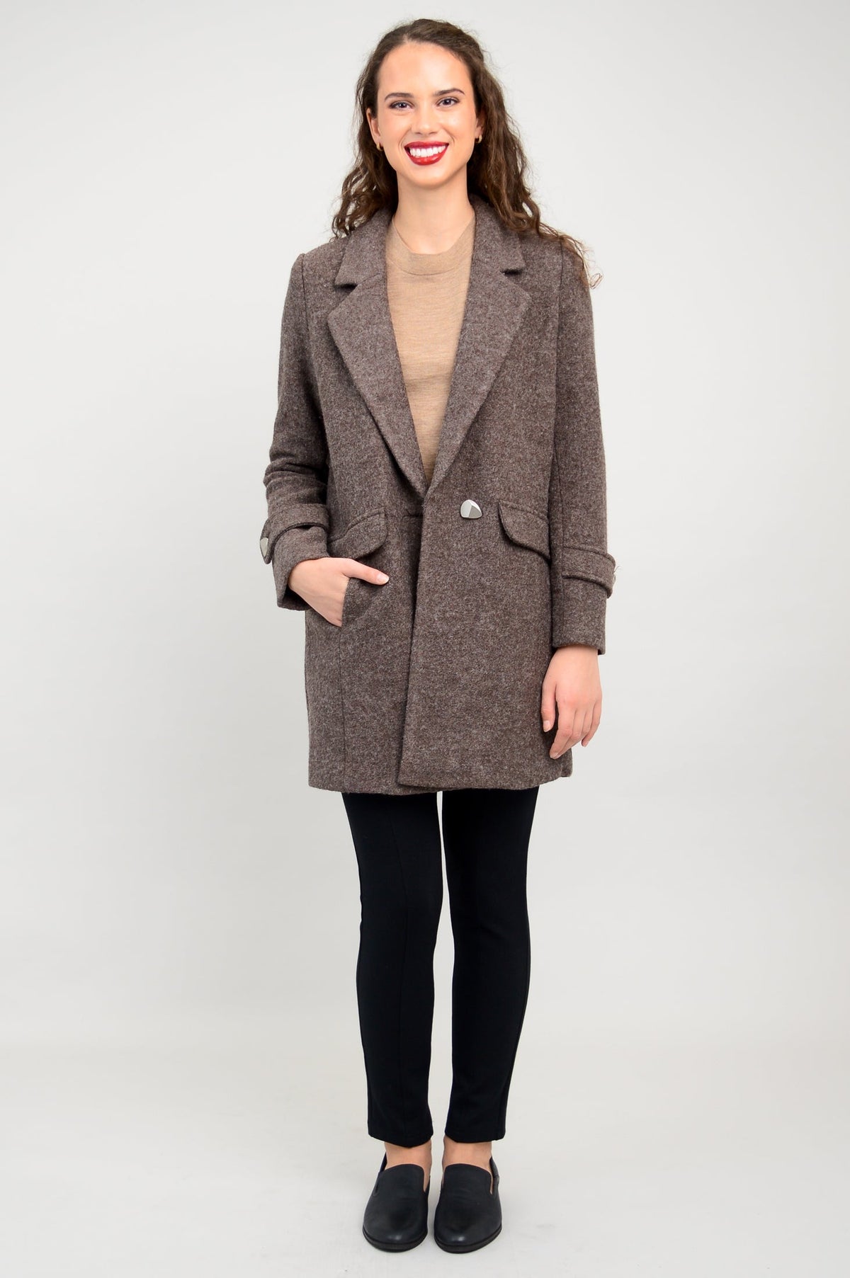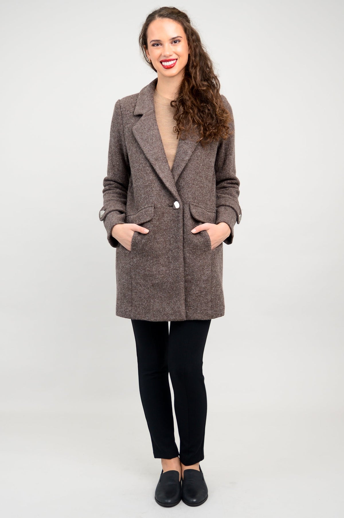 The Milan Coat is single-breasted with one-button closure and a notched lapel. Decorative button flaps at the wrists match the closure button. Faux flaps on the front hide generous inseam pockets and maintain a sleek look. The hemline of the coat falls to mid-thigh, ensuring full coverage of the hips. Wear the Milan with a turtleneck sweater and boots for a chic, city look.