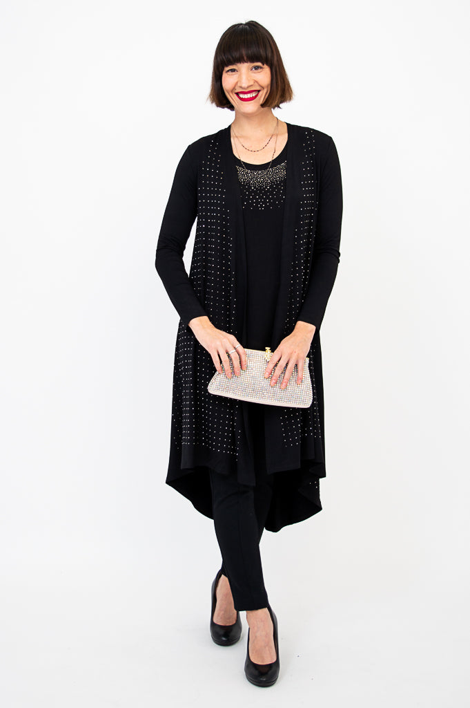 Add a little bling to your outfit! The Priscilla Jacket features little gemstones throughout the body. This easy style is the perfect piece to enhance a simple outfit.