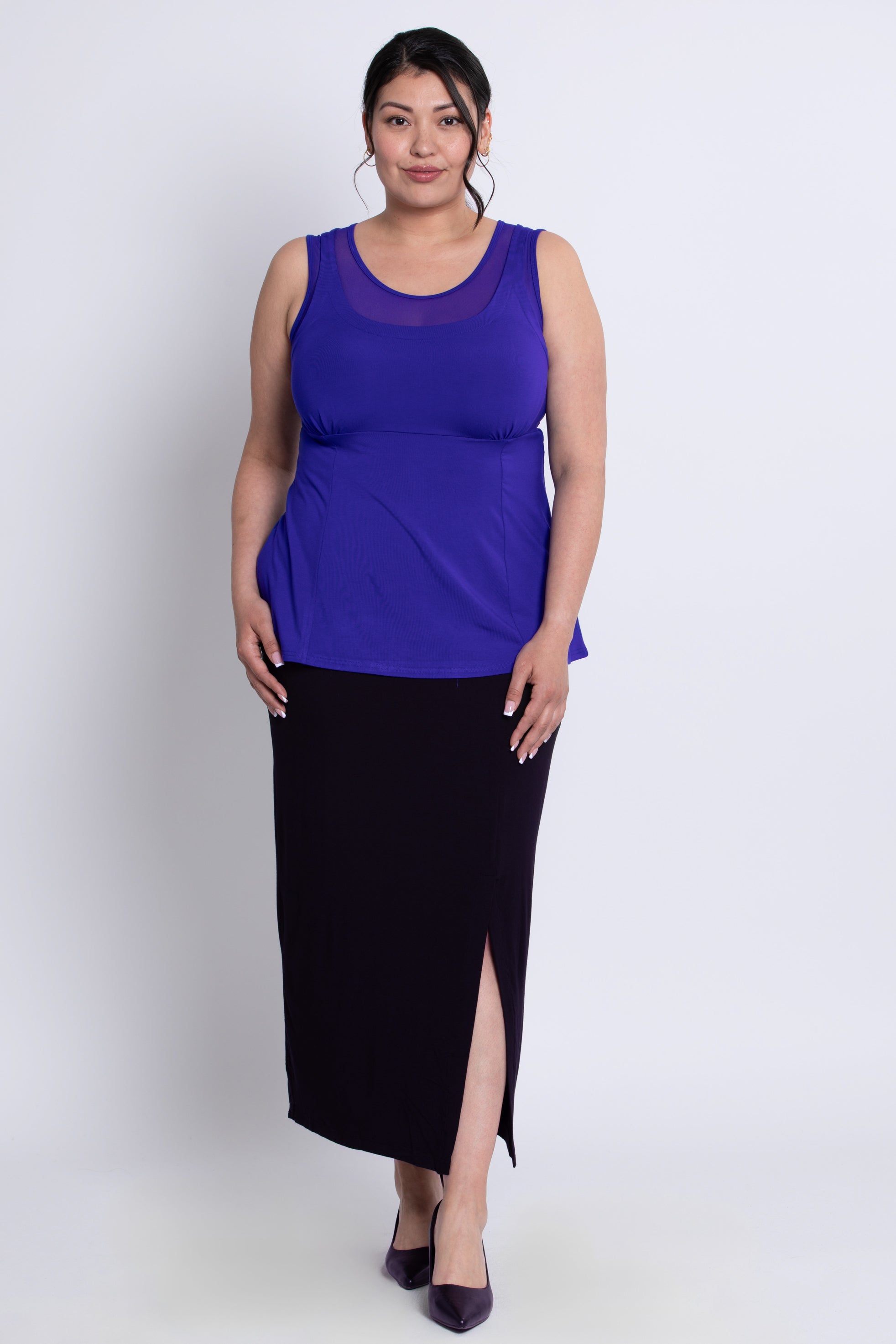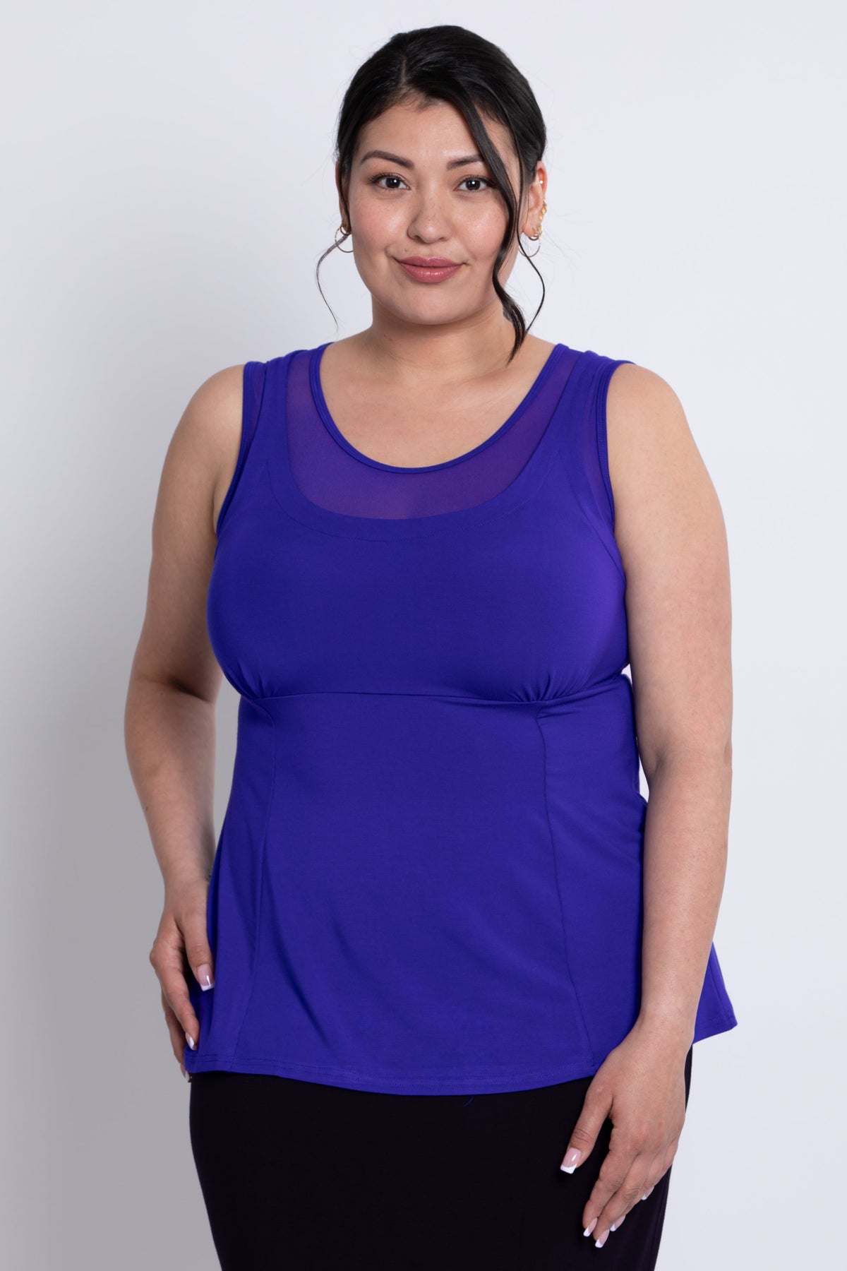The Rhine Tank features mesh underlay to give the illusion of layering and a play on texture. The empire waist and fitted bodice contour the body for a refined look.