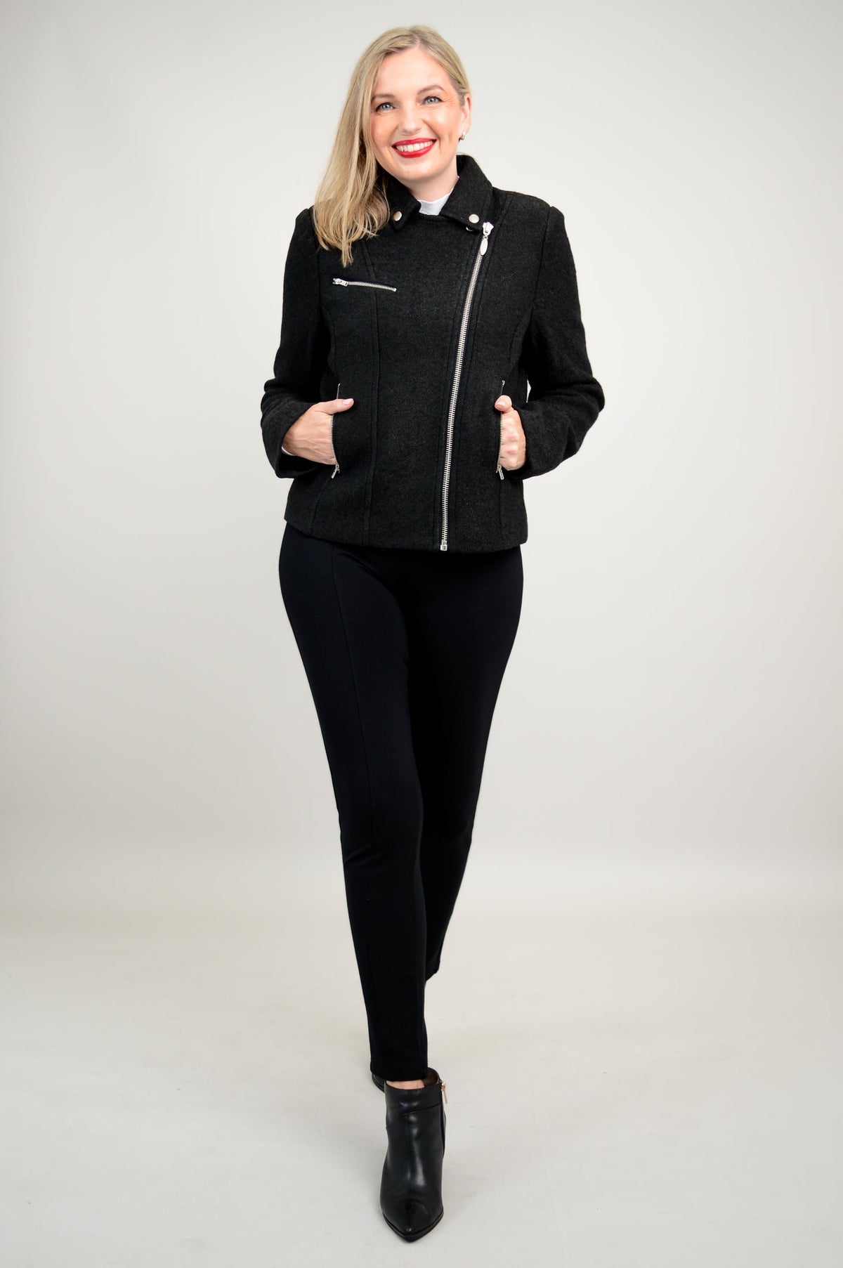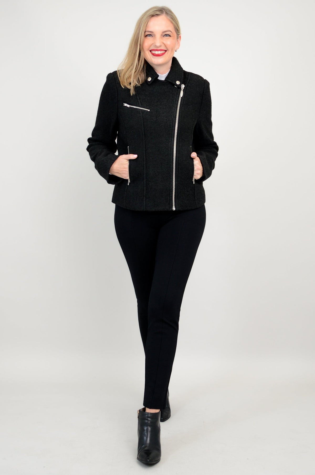 Wear the Ronnie jacket with a turtleneck sweater, pants and a pair of boots.