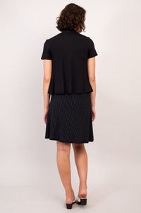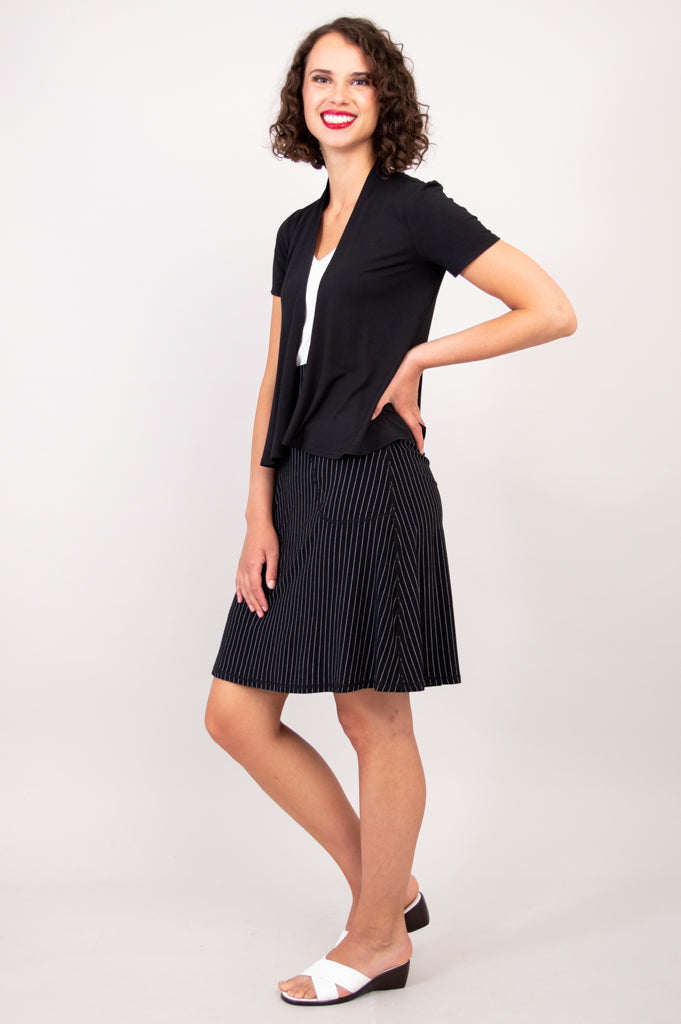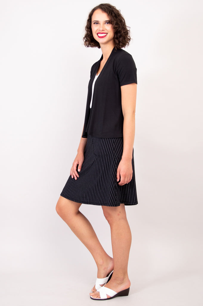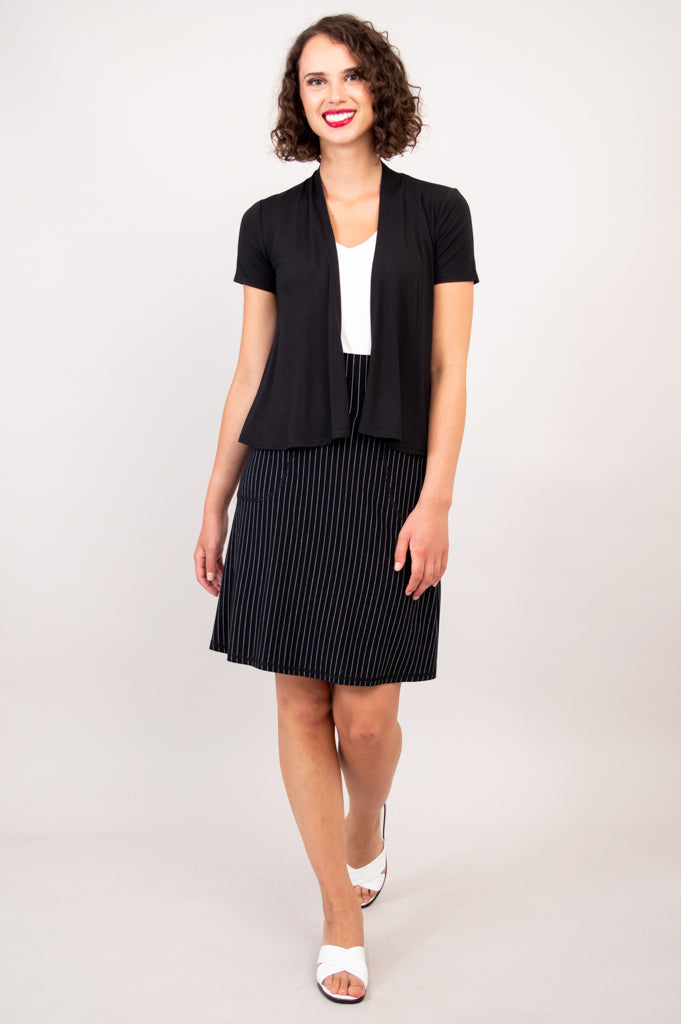 With short sleeves, the Sherry functions as a great layering piece. This open jacket falls from the shoulders, tapers slightly at the high waist, and flares just a touch around the high hip. Front panels are lightly rounded, adding movement around the hips and contrast with the fitted shoulder. This subtle shaping flatters the upper body with both shape and flow. Pair the Sherry Jacket with our Ritzy or Marcie Tanks for a clean and cohesive look.