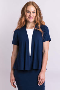 With short sleeves, the Sherry functions as a great layering piece. This open jacket falls from the shoulders, tapers slightly at the high waist, and flares just a touch around the high hip. Front panels are lightly rounded, adding movement around the hips and contrast with the fitted shoulder. This subtle shaping flatters the upper body with both shape and flow. Pair the Sherry Jacket with our Ritzy or Marcie Tanks for a clean and cohesive look.
