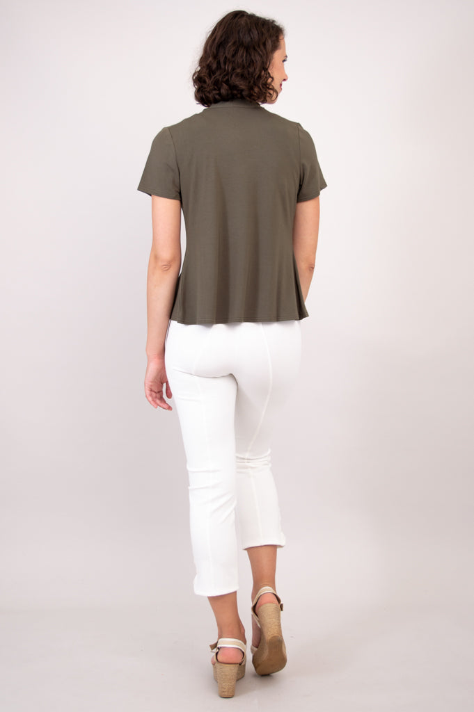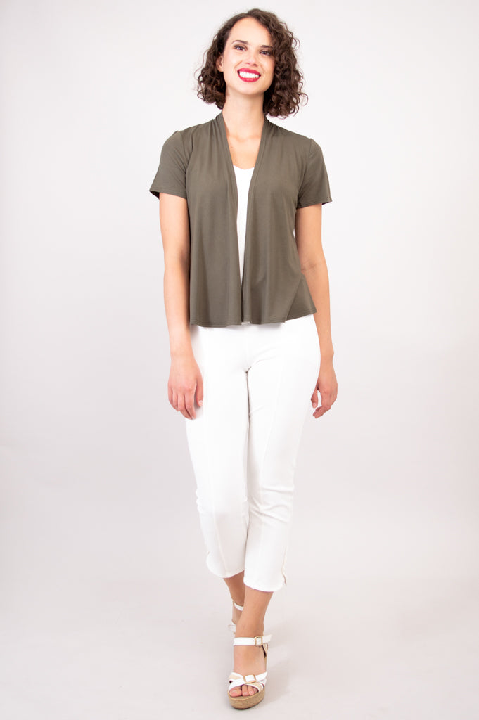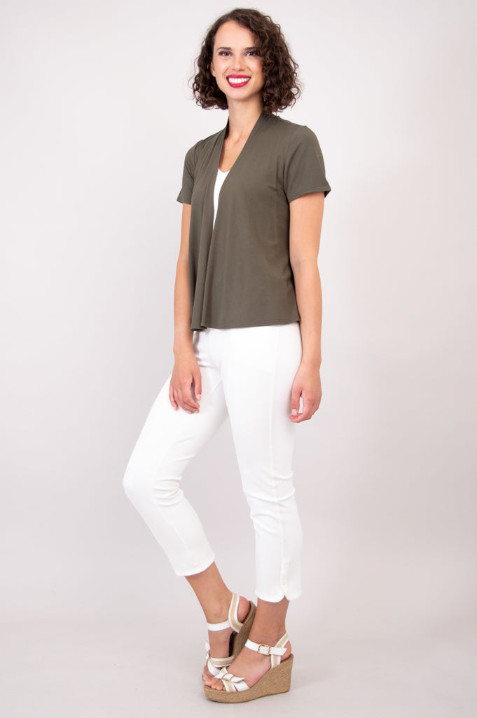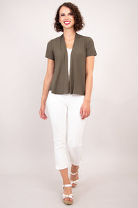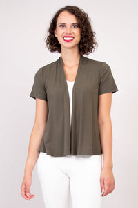 With short sleeves, the Sherry functions as a great layering piece. This open jacket falls from the shoulders, tapers slightly at the high waist, and flares just a touch around the high hip. Front panels are lightly rounded, adding movement around the hips and contrast with the fitted shoulder. This subtle shaping flatters the upper body with both shape and flow. Pair the Sherry Jacket with our Ritzy or Marcie Tanks for a clean and cohesive look.