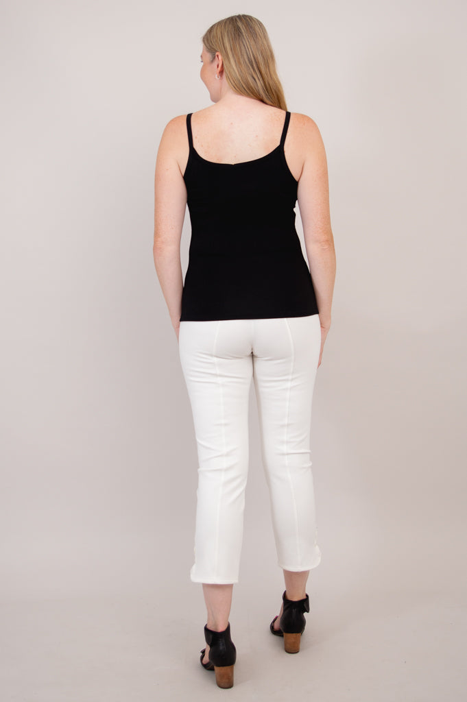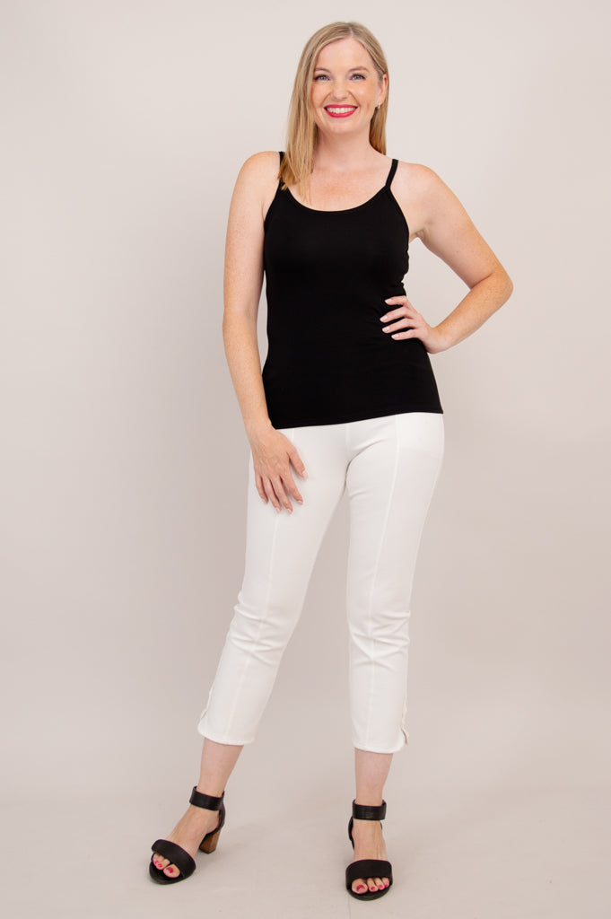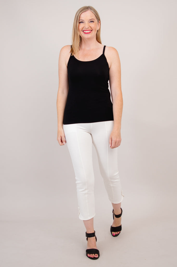 This tank features a scoop neck that is mirrored in the back. The thin straps, and body-con fit make this tank perfect for adding an additional layer to any outfit and an absolute essential in any wardrobe. The hem hits at the natural hip making this spaghetti strap tank incredibly versatile.