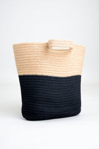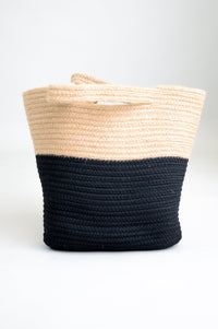 A medium rattan shopper bag with an internal cloth drawstring pocket.