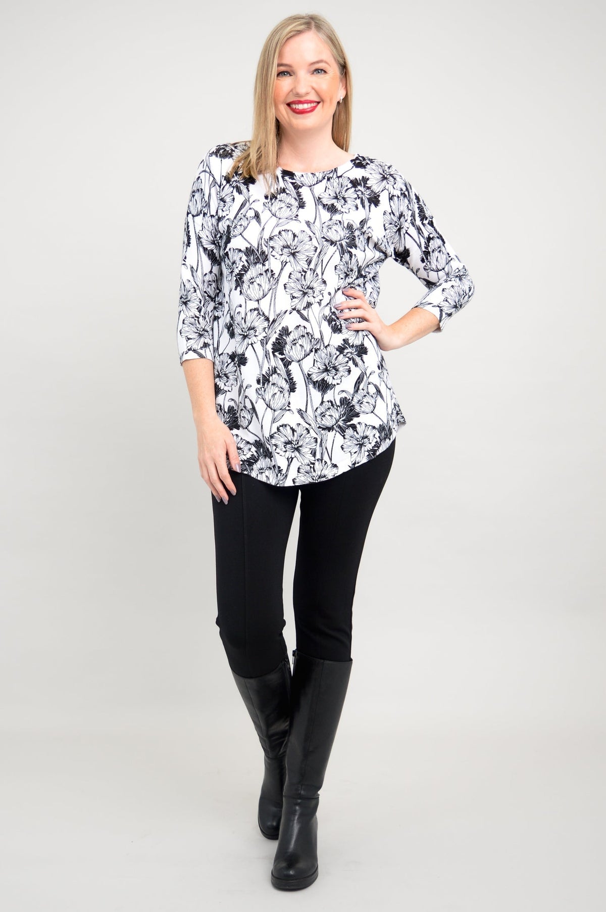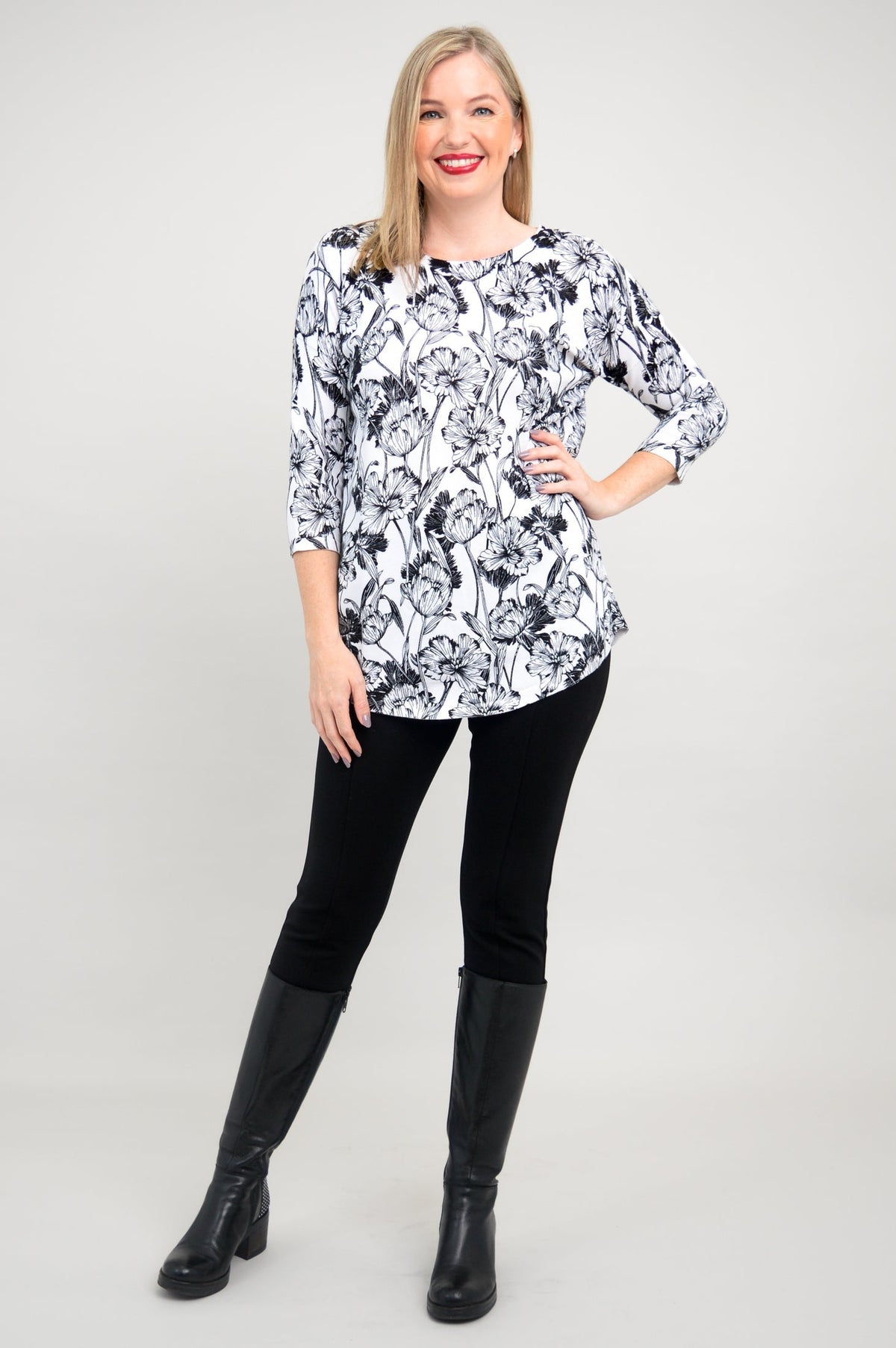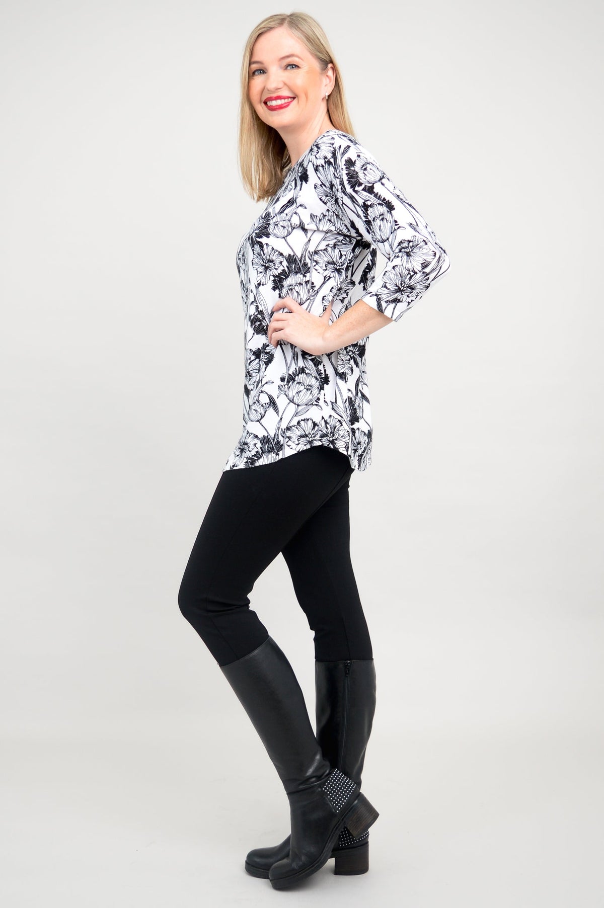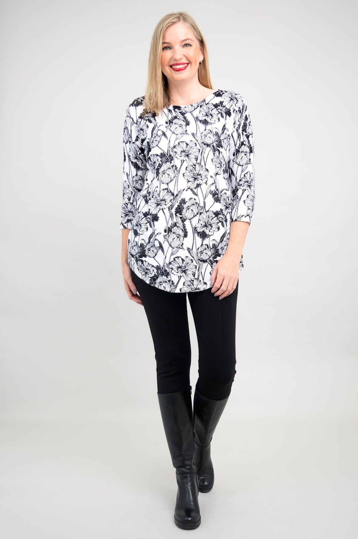 A casual pullover sweater, in breathable, temperature-regulating Bamboo/Cotton. 3/4 length sleeves and drop shoulders make for a relaxed look. The rounded hem is on the longer side, allowing for the Tina to also be worn as a tunic. Wear it with slim pants or leggings for a balanced look. Tina looks fantastic when paired with tall boots, for an easy Winter/Fall look.