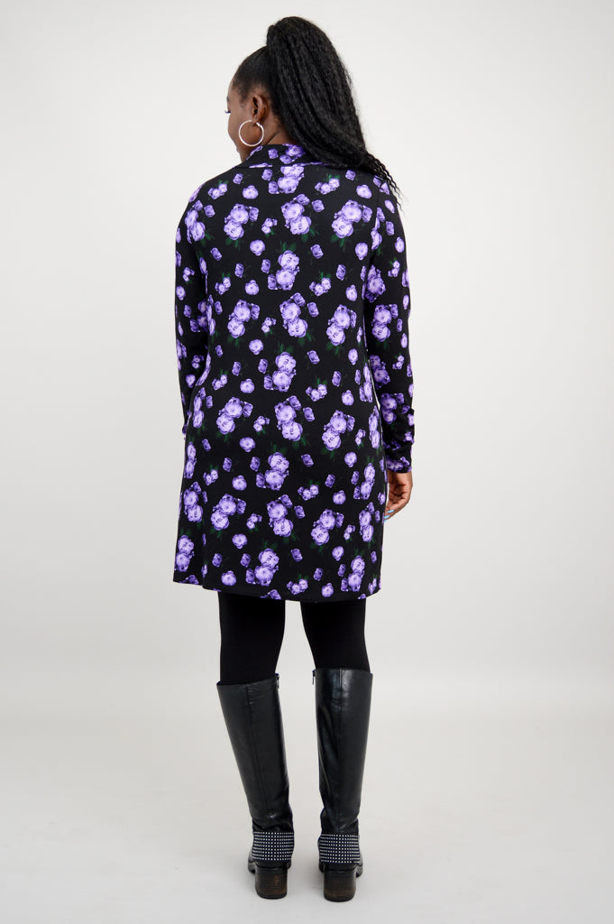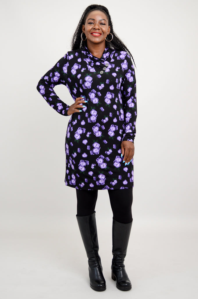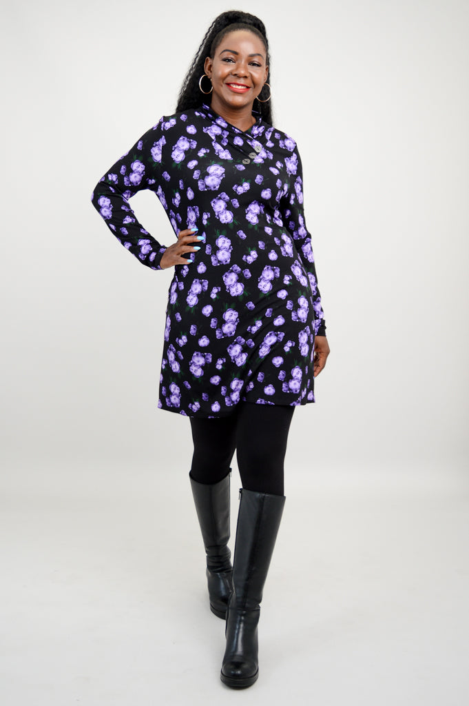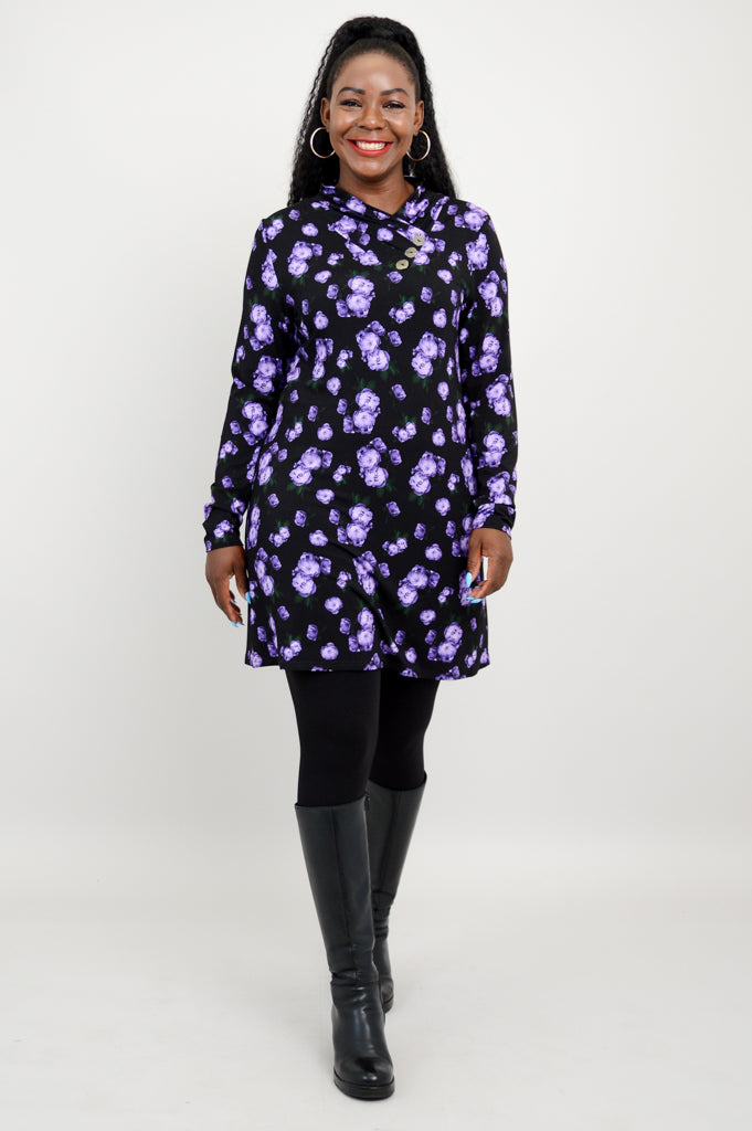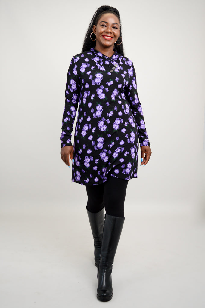 A draped mock neck with decorative, off-centre buttons is the star of this piece. Fitted through the sleeves and bodice, the hemline falls to just below the hip. Style the trinity with a vest, fitted pants and boots.