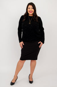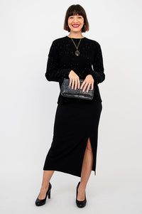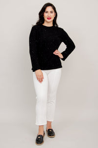 The Whitaker Sweater will add a touch of sparkle to any look! Elegant sparkles are sprinkled though the fabric making this sweater great for dressing up or down. The long sleeves and scoop neck and hem ending at the hip add to the versatility to this sweater.